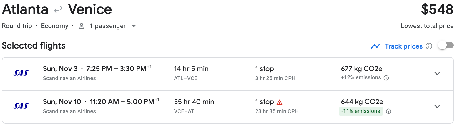 Flights from Atlanta to Venice are also available at a significant markdown in November. Scandinavian Airlines has round-trip fares from Hartsfield-Jackson Atlanta International Airport (ATL) to Venice for $548, which is notably lower than normal for this route. Please note that there is a long layover in Copenhagen on the return flight, so you may have a chance to plan a fun daytrip in the Danish capital.