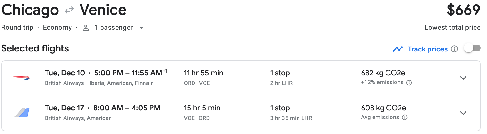 We found some good prices for Venice out of Chicago, too. British Airways has flights in December and January from O'Hare International Airport (ORD) for $669 round-trip.
