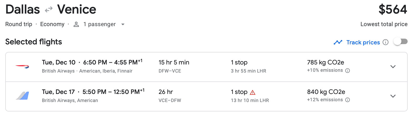If you live in Dallas, December is a good time to visit Venice. British Airways has flights out of Dallas Fort Worth International Airport (DFW) for only $564 round-trip. That's a good price for this route during the holiday season. Note that the return flight has an extended layover in London.