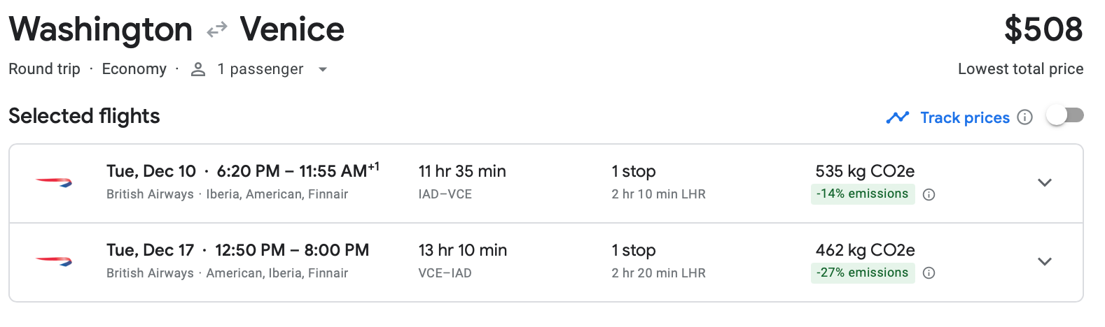 We also found great bargains out of Washington, D.C., in this deal. British Airways has round-trip flights from $508 from Dulles International Airport (IAD) to Venice in early December.