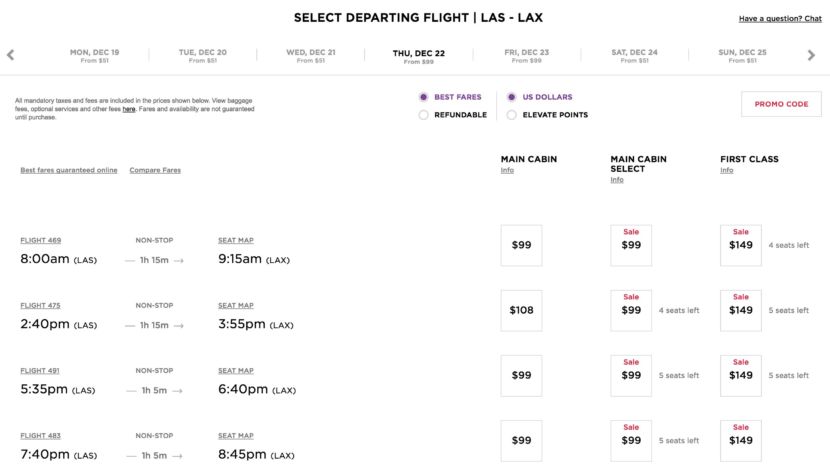 For all of those who have yet to book Christmastime travel — this one's for you. Virgin America has shared the details of a flash sale it's running through Thursday December 8, through which you can book seats in the airline's Main Cabin Select seats from just $99 each way on select routes, including dates just before and just after Christmas. First-class seats are on sale as well. Availability is limited, but there are definitely some great deals to be had. In some cases, this promo has made Main Cabin Select seats cheaper than regular economy seats on the same flight, as you can see below. Since these fares are only available on Virgin America's site, you're unfortunately unable to use the Visa Infinite airfare discount or 50% Amex points rebate with this flash sale.
