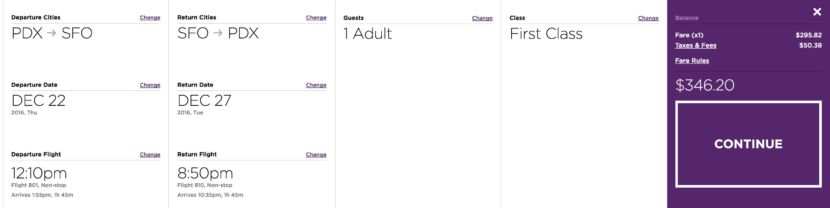 Portland (PDX) to San Francisco (SFO) for $346 round-trip in first class: