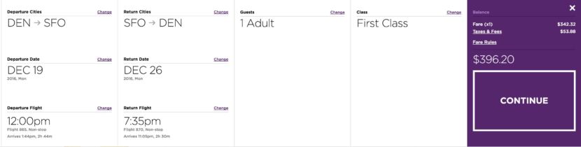Denver (DEN) to San Francisco (SFO) for $396 round-trip in first class: