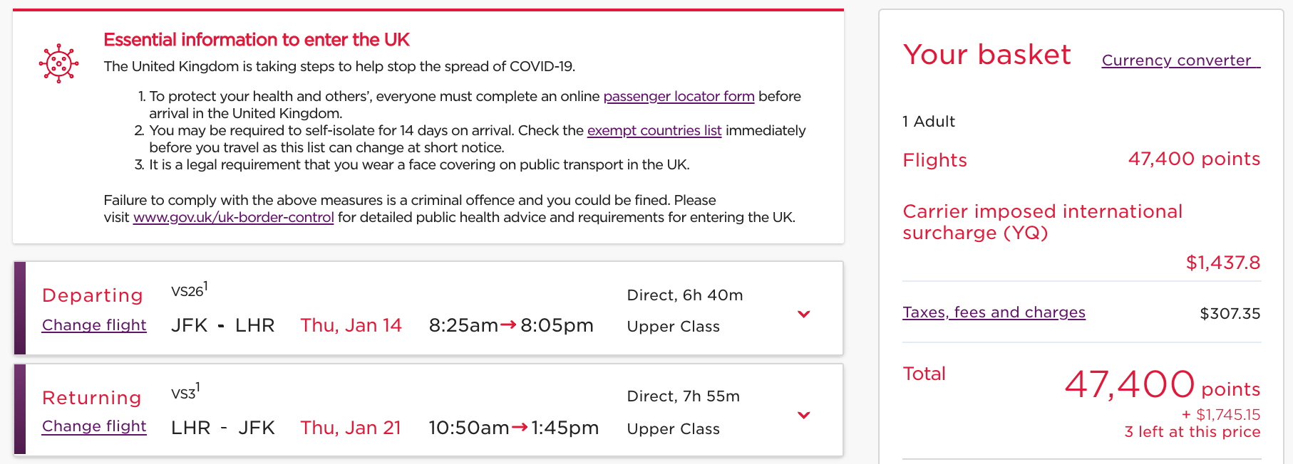 New York (JFK) to London (LHR) for 47,400 Virgin Points + $1,745 round-trip in Upper Class (23,700 Virgin Points one-way):