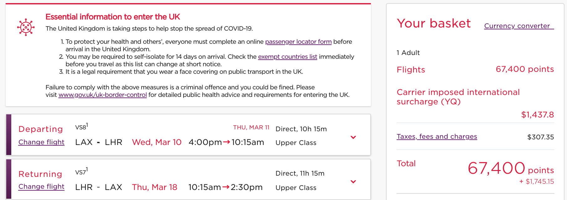 Los Angeles (LAX) to London (LHR) for 67,400 Virgin Points + $1,745 round-trip in Upper Class (33,700 Virgin Points one-way):