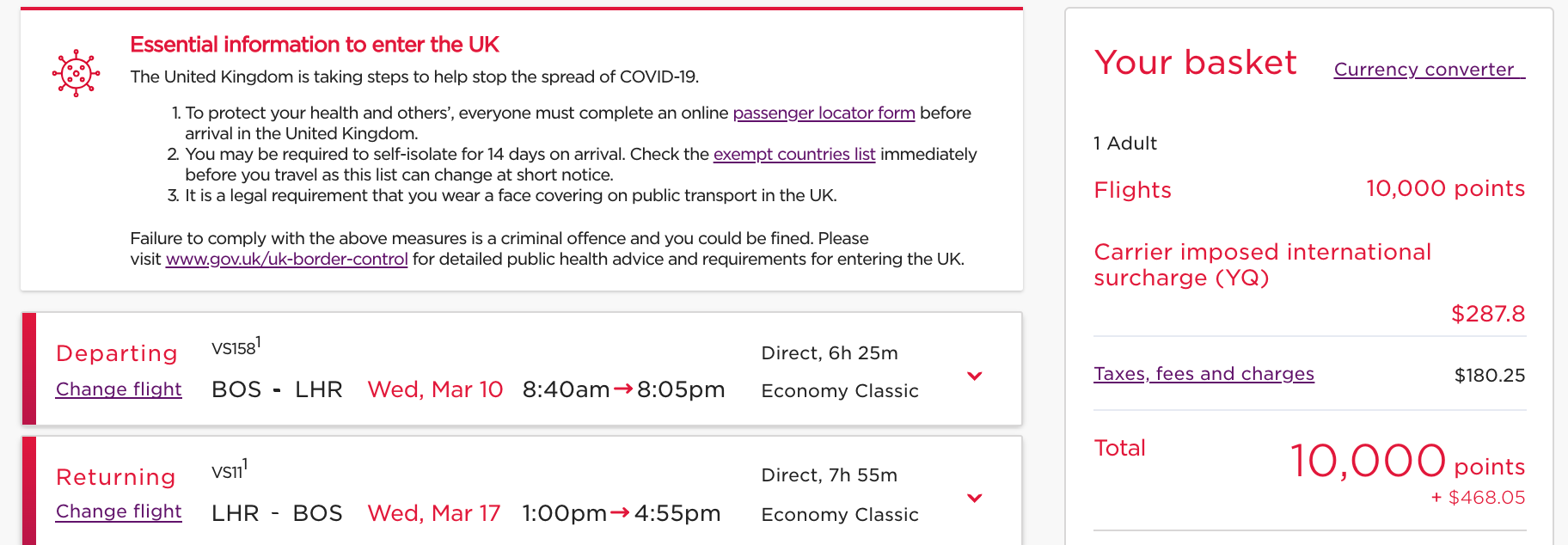 Boston (BOS) to London (LHR) for 10,000 Virgin Points + $468 round-trip in economy (5,000 Virgin Points one-way):