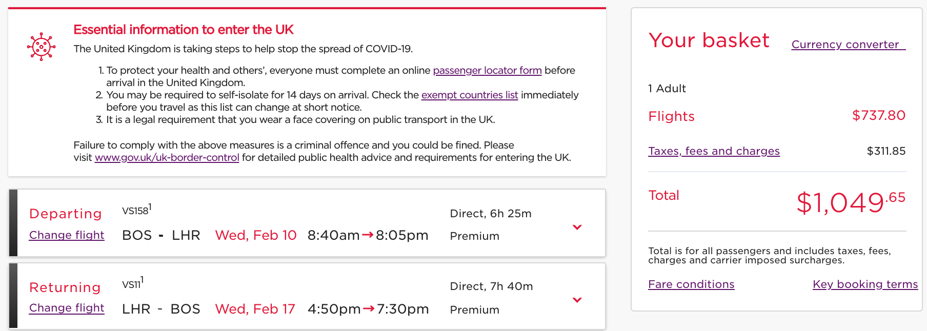 Boston (BOS) to London (LHR) for $1,050 round-trip in Premium:
