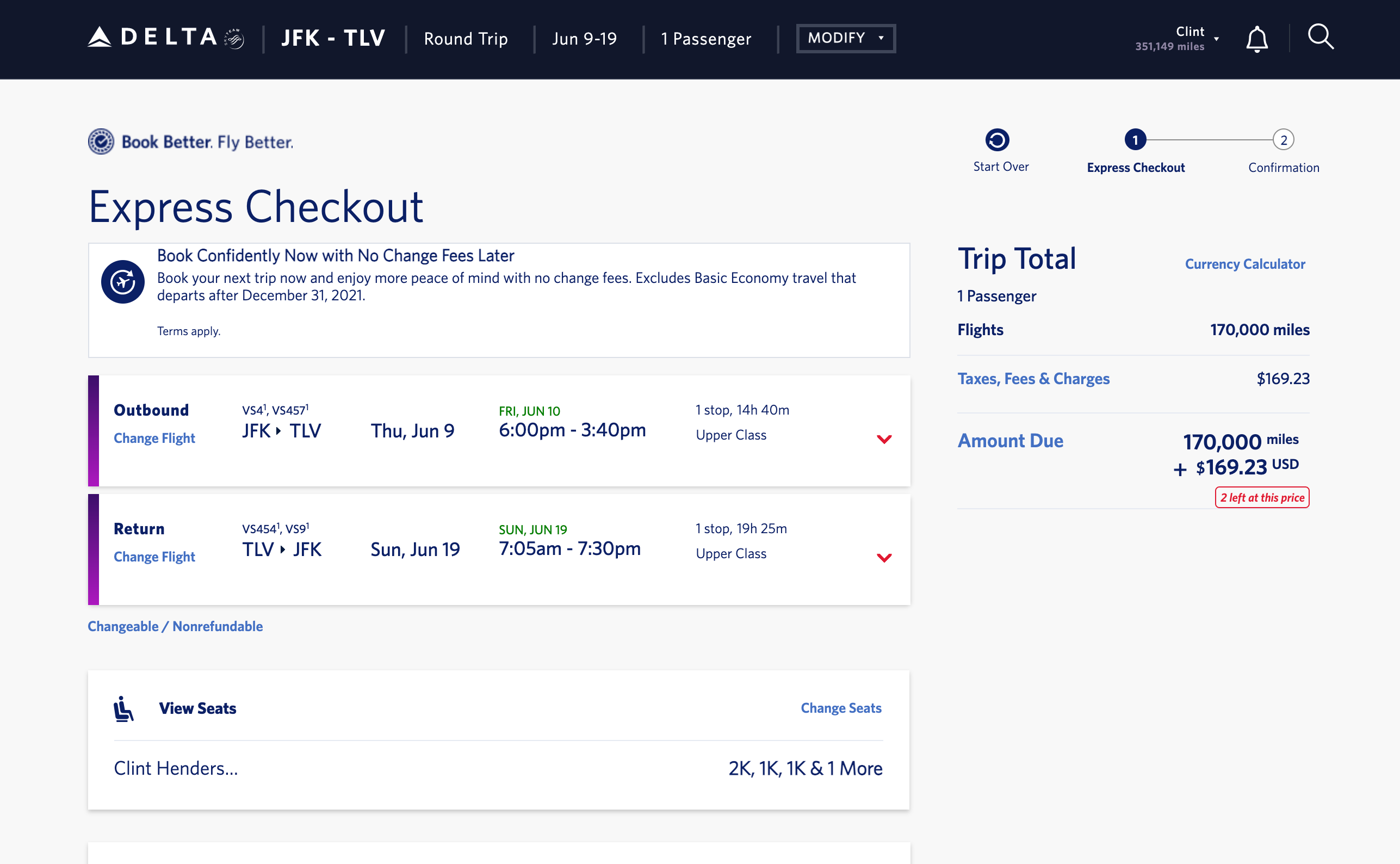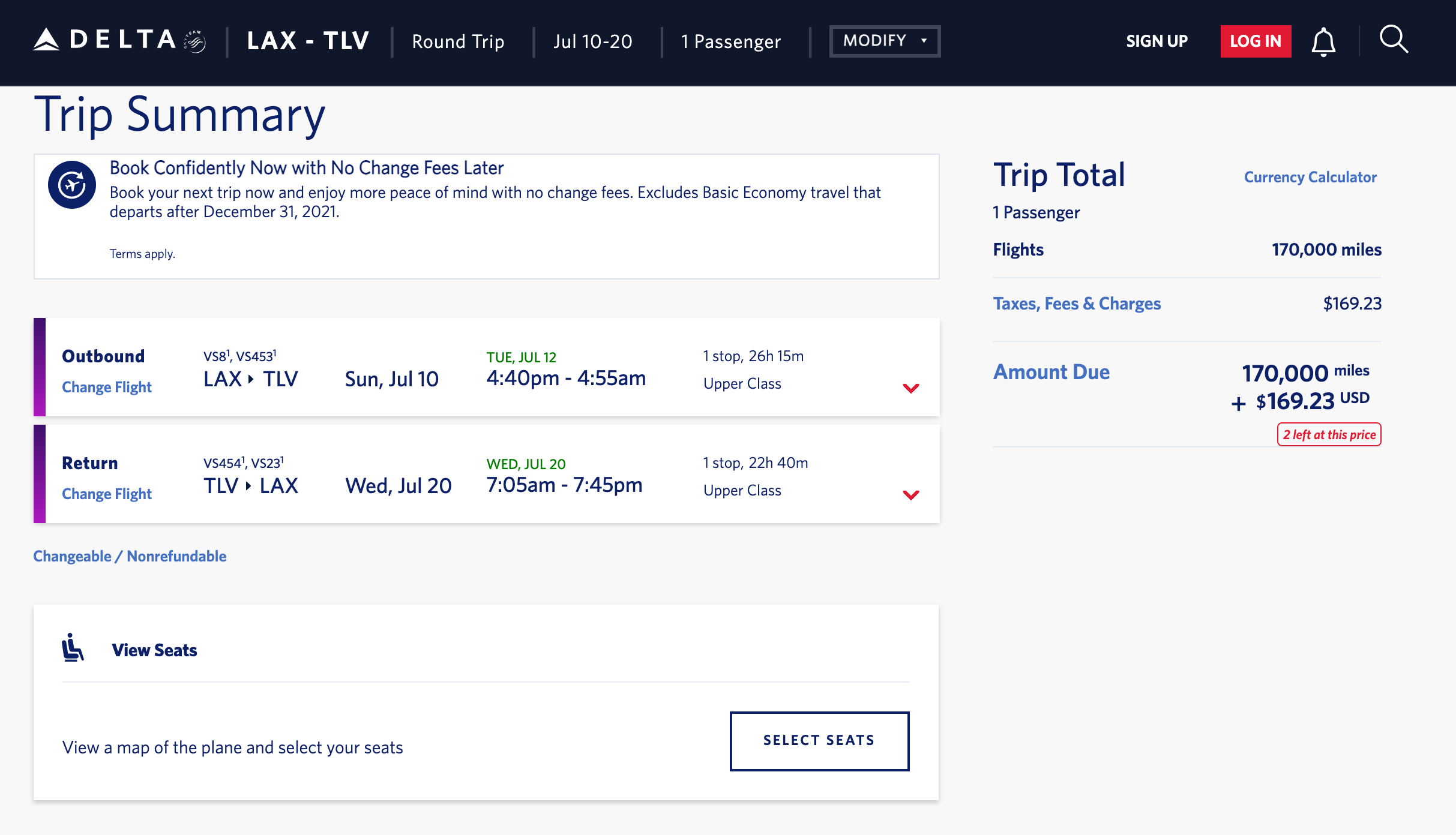 In the end, this trip cost me 170,000 Delta SkyMiles plus $169.23 in taxes and fees. Not bad considering this itinerary is more than $2,700 if booked for cash (as a refundable fare).