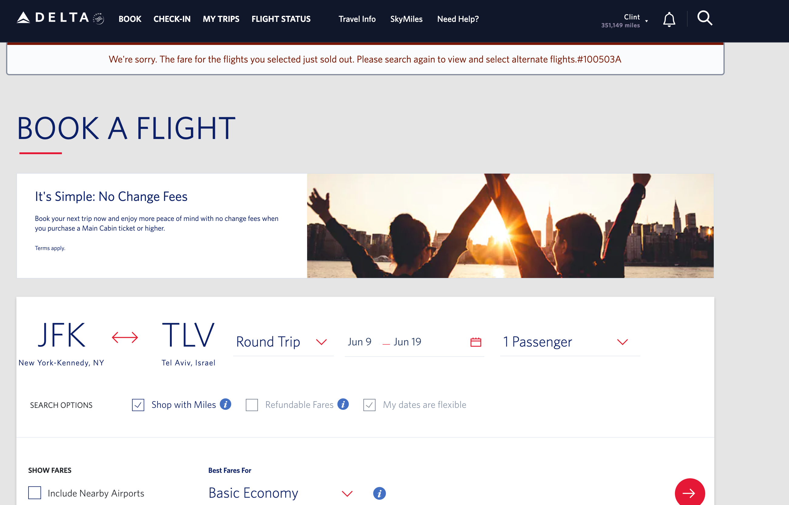 The first couple of times I tried to book the trip this time, I got a weird error message saying the flights were sold out, but I was eventually able to get the flights booked at Delta.com. If you are having trouble, try alternate dates.