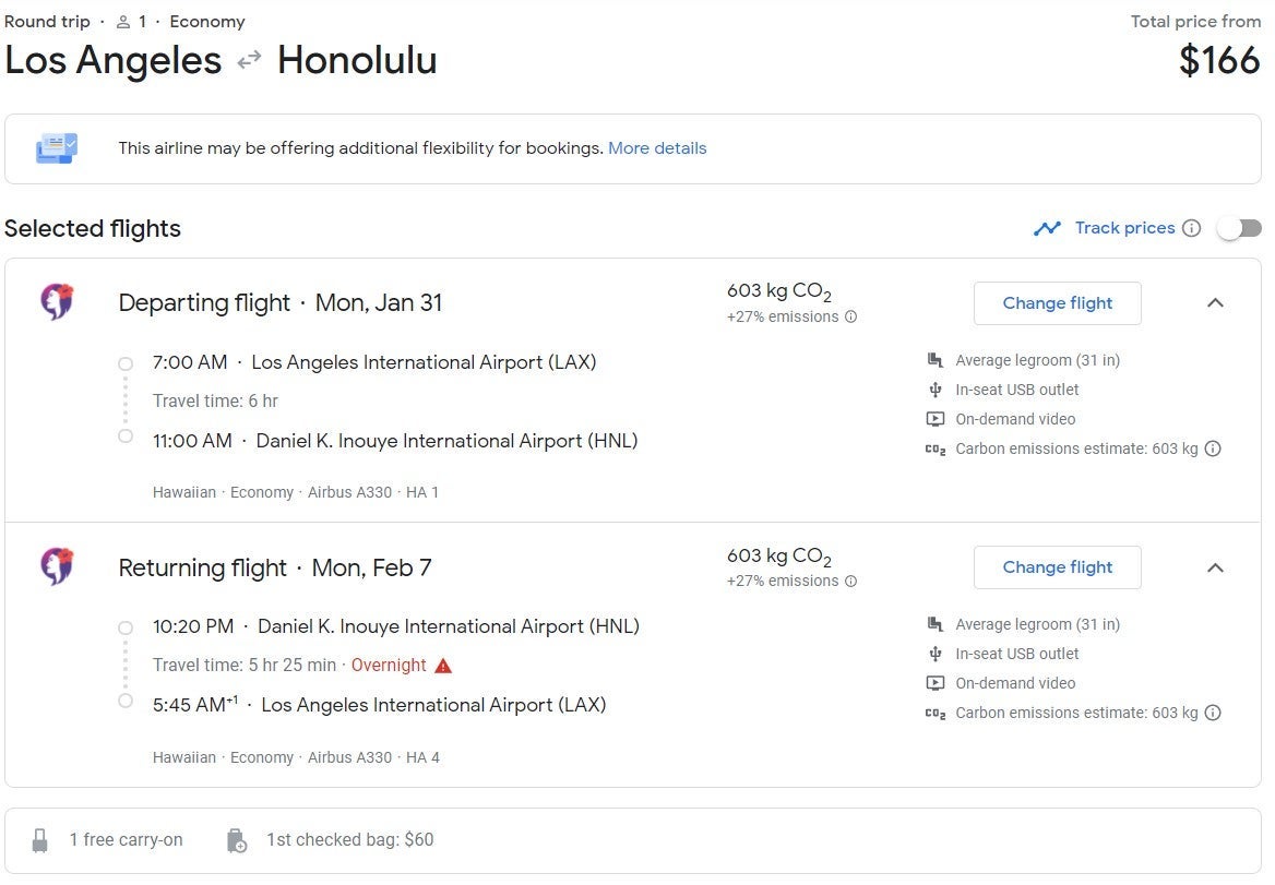 Californians flying out of Los Angeles can snag a round-trip flight on Hawaiian Airlines from Los Angeles International Airport (LAX) to Honolulu (HNL) at $166 from the end of January to the beginning of February.