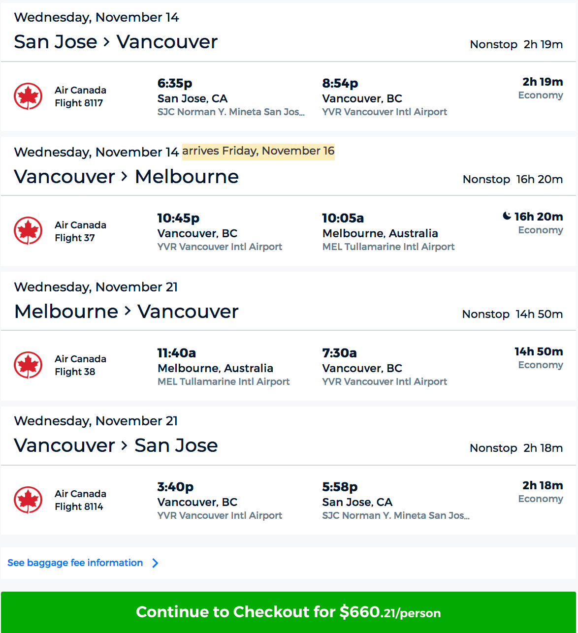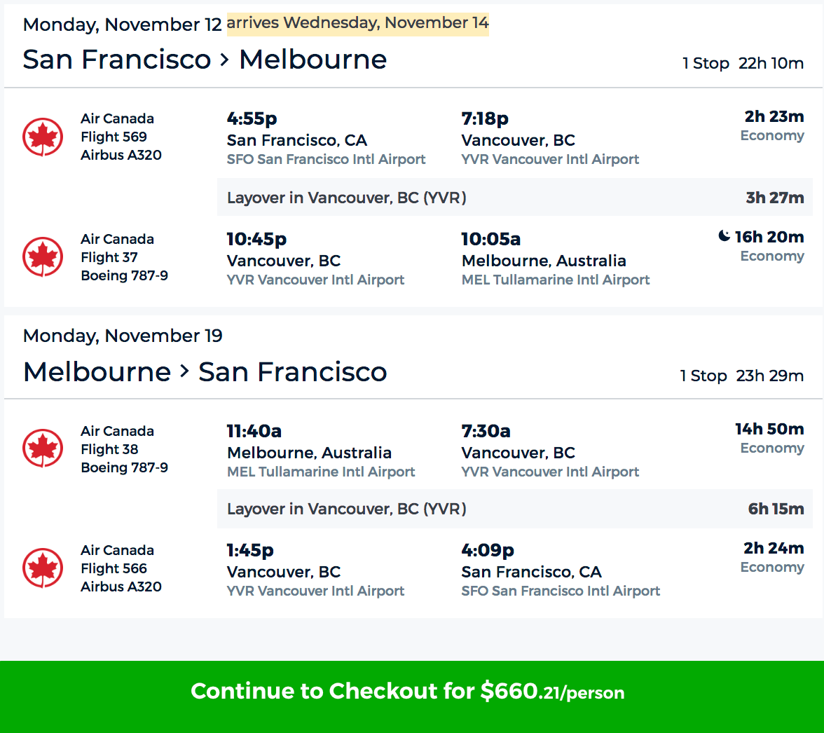 San Jose (SJC) to Melbourne (MEL) for $660 round-trip on Air Canada via Priceline: