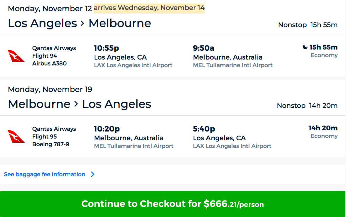 Los Angeles (LAX) to Melbourne (MEL) for $666 round-trip on Qantas Airways via Priceline: