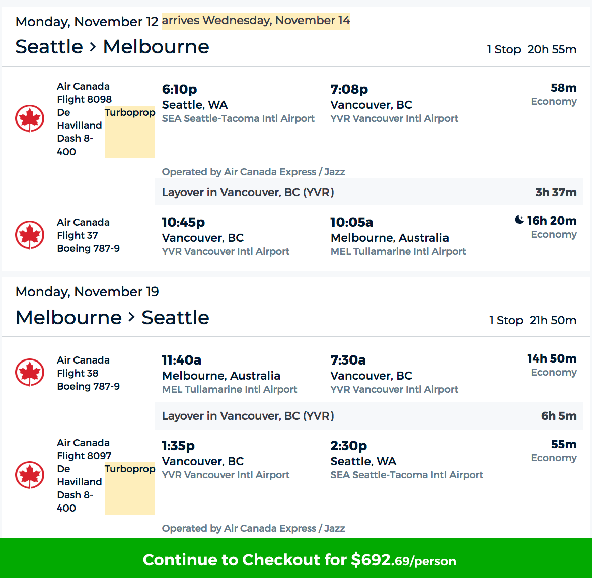 Seattle (SEA) to Melbourne (MEL) for $693 round-trip on Air Canada via Priceline: