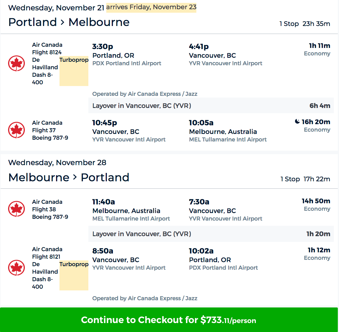 Portland (PDX) to Melbourne (MEL) for $733 round-trip on Air Canada via Priceline: