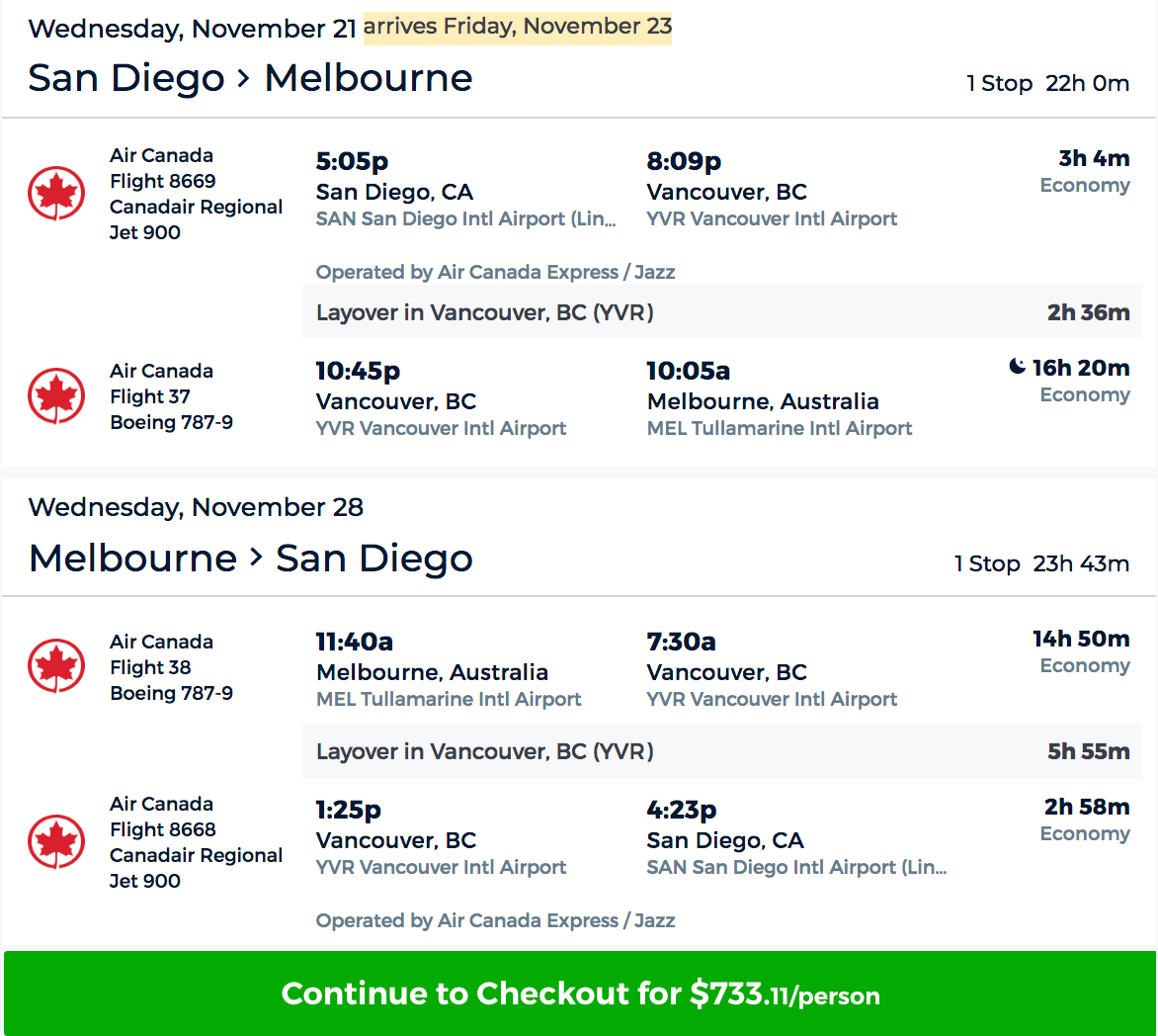 San Diego (SAN) to Melbourne (MEL) for $733 round-trip on Air Canada via Priceline: