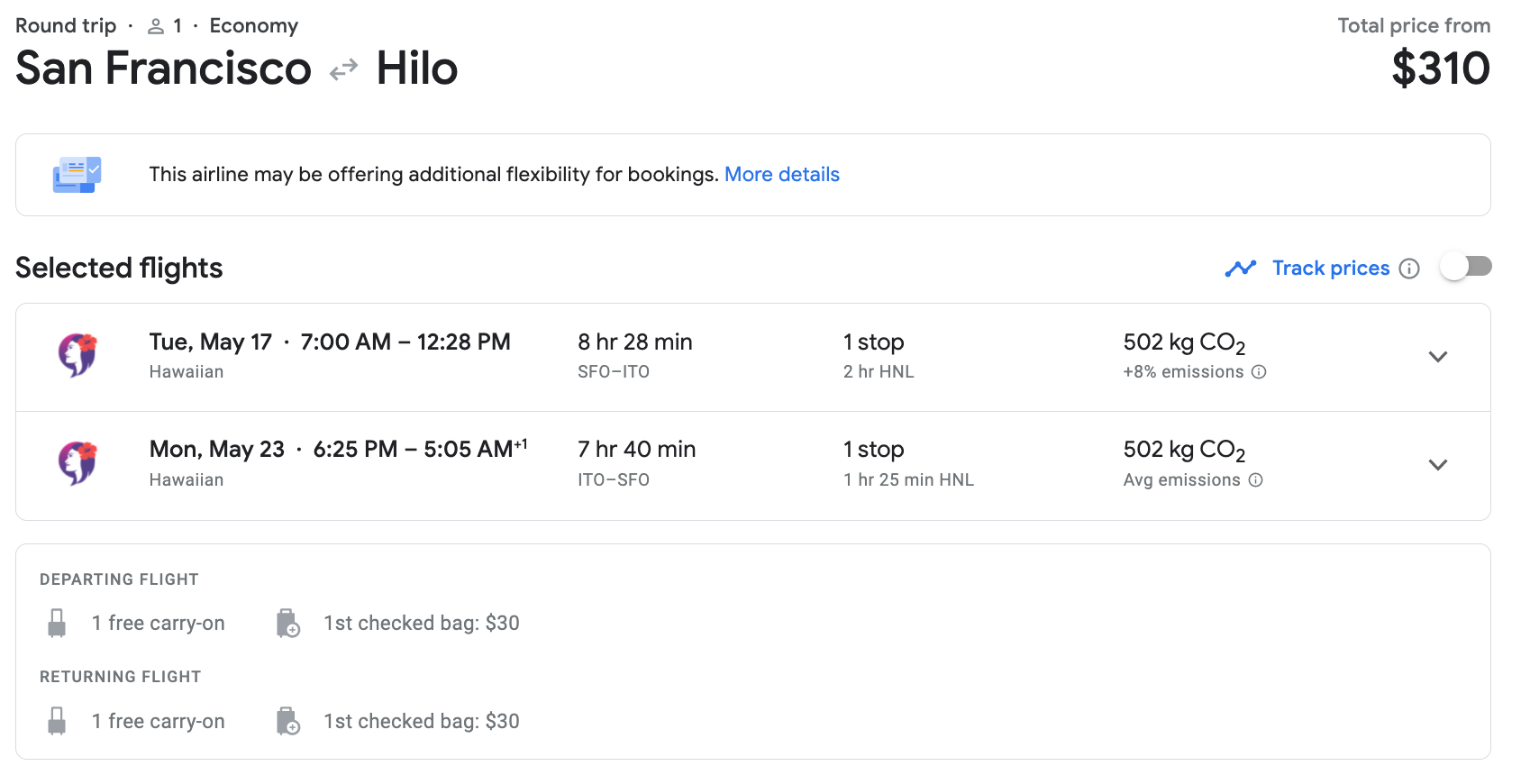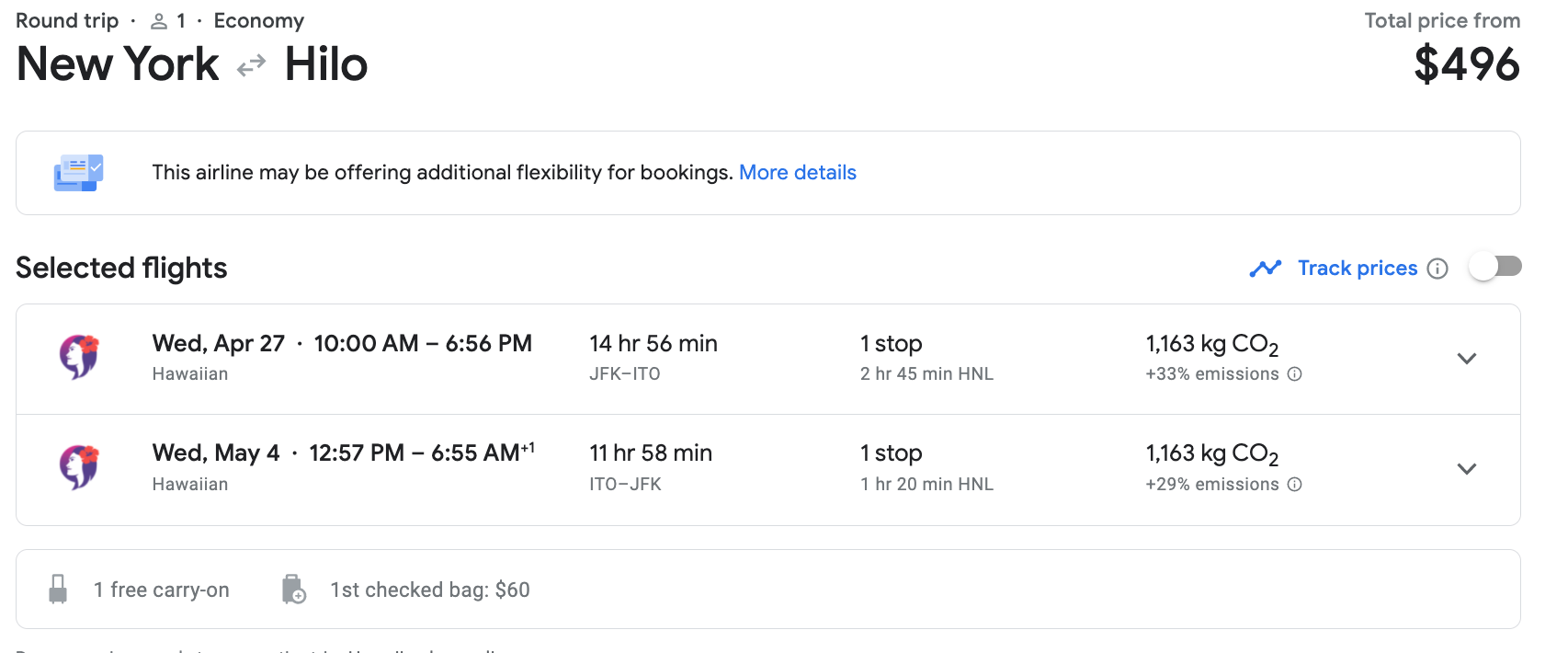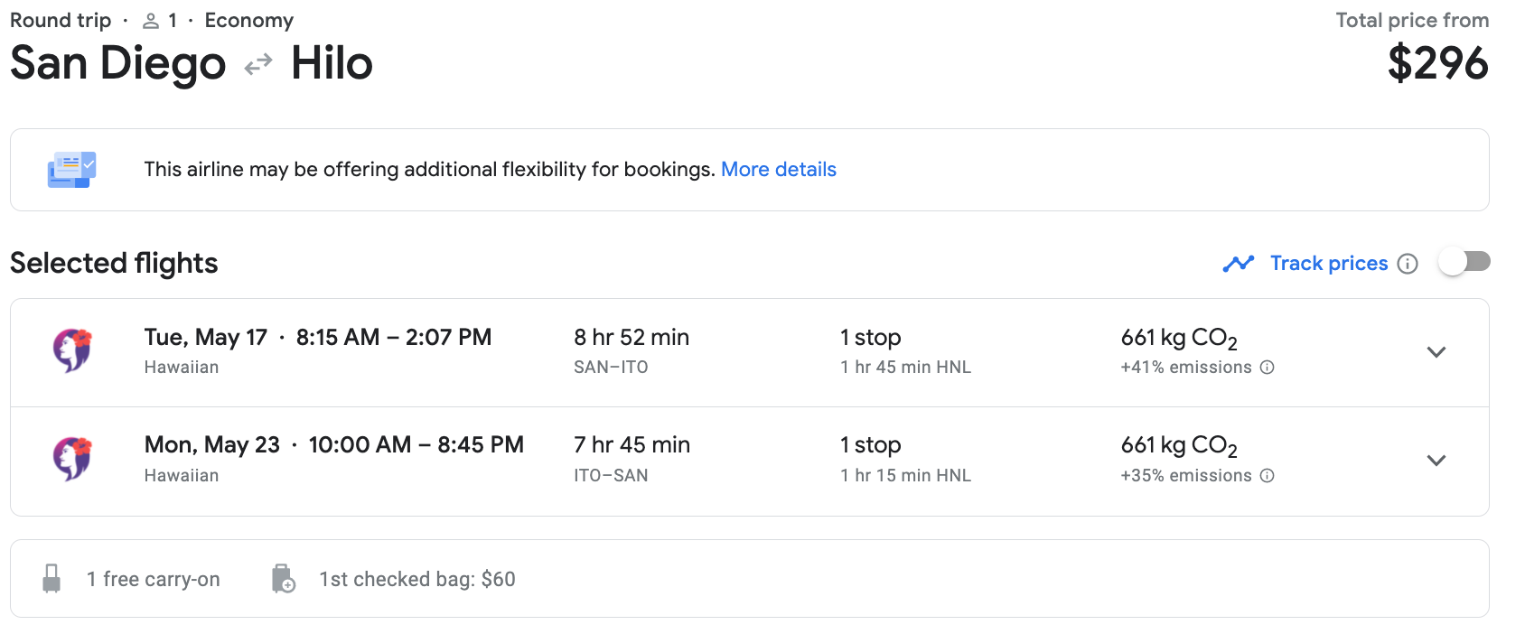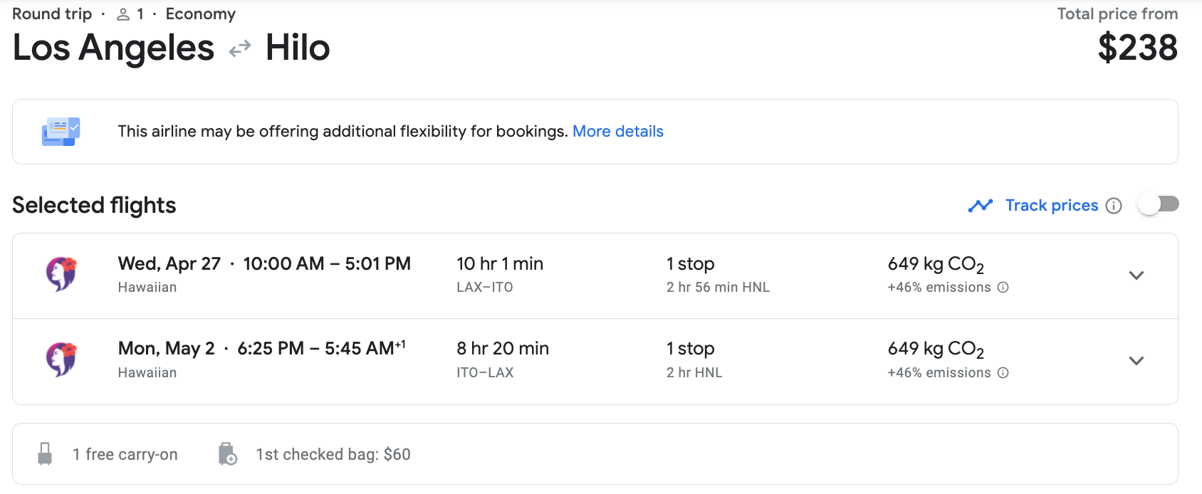 Below is a flight from LAX to Hilo (ITO) in late April for $238 roundtrip, which is more than 50% cheaper than the usual price. You get a free carry-on bag, but if you like to travel with more, your first checked bag is $60.