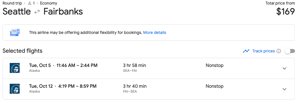 You could catch a flight as soon as next week. For folks from Seattle, congrats, as you are about to enjoy the cheapest fares: just $169 for a round-trip, nonstop flight to Fairbanks, departing in two weeks on Alaska's home airline, Alaska Airlines. The below flight is almost half its normal price.