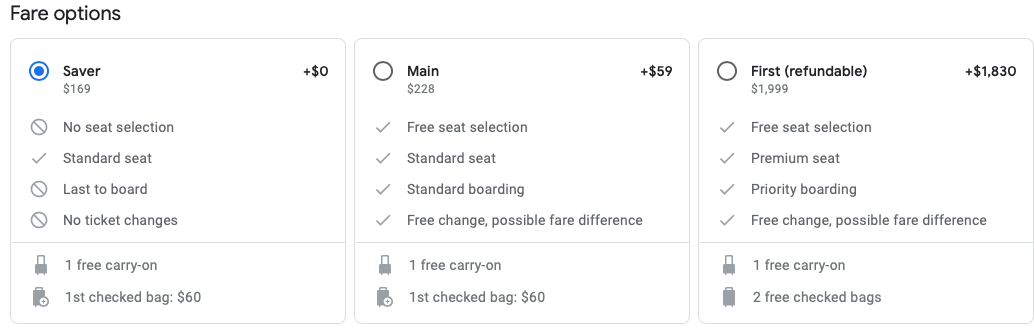 Should you find another flight in this deal on United, note that their economy fare does not include a carry-on bag, so factor in an extra $25. Airlines generally charge around $40 each way to upgrade to regular economy, in addition to $30-$35 each way to check a bag.