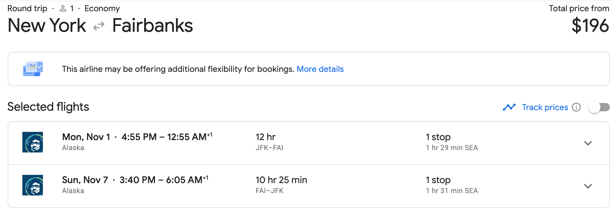 While cross-country flights are generally going to be more expensive, you can get a round-trip flight from New York to Fairbanks for less than $200 with just a 1 1/2-hour layover each way.