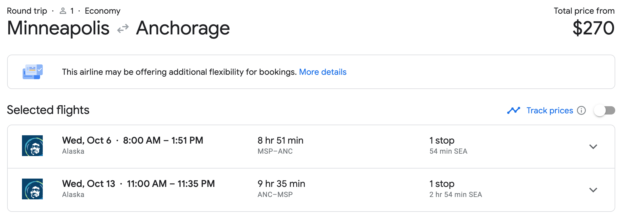 Turning our attention to Anchorage, you'll find one of the best routes in the deal is for those flying out of Minneapolis-St. Paul (MSP) for under $300 on — you guessed it — Alaska Airlines.