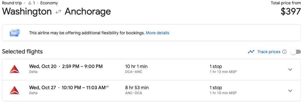 I did find a decent round-trip flight for less than $400 on Delta, from Reagan National Airport (DCA) in Washington, D.C., to Anchorage.