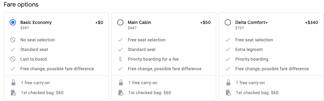As is the case with the Alaska Airlines flights, this is for Delta's lowest fare, basic economy, which includes one complimentary carry-on sans seat selection, but does allow you to change your flight for free, while paying any difference in fares.
