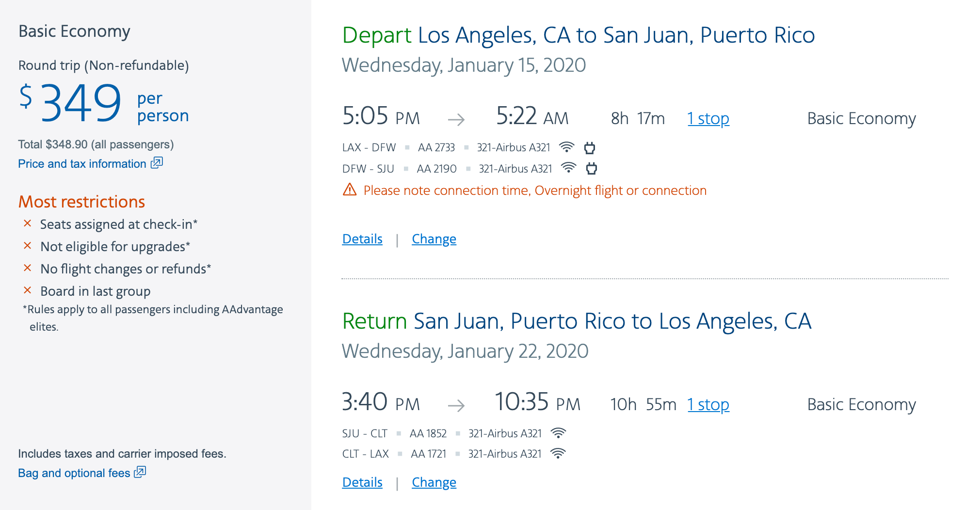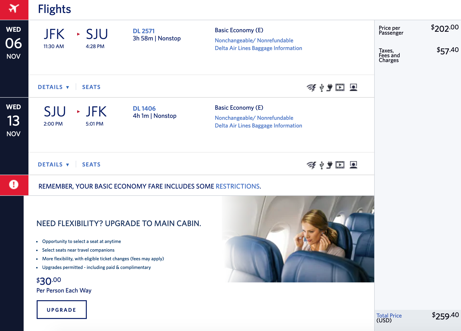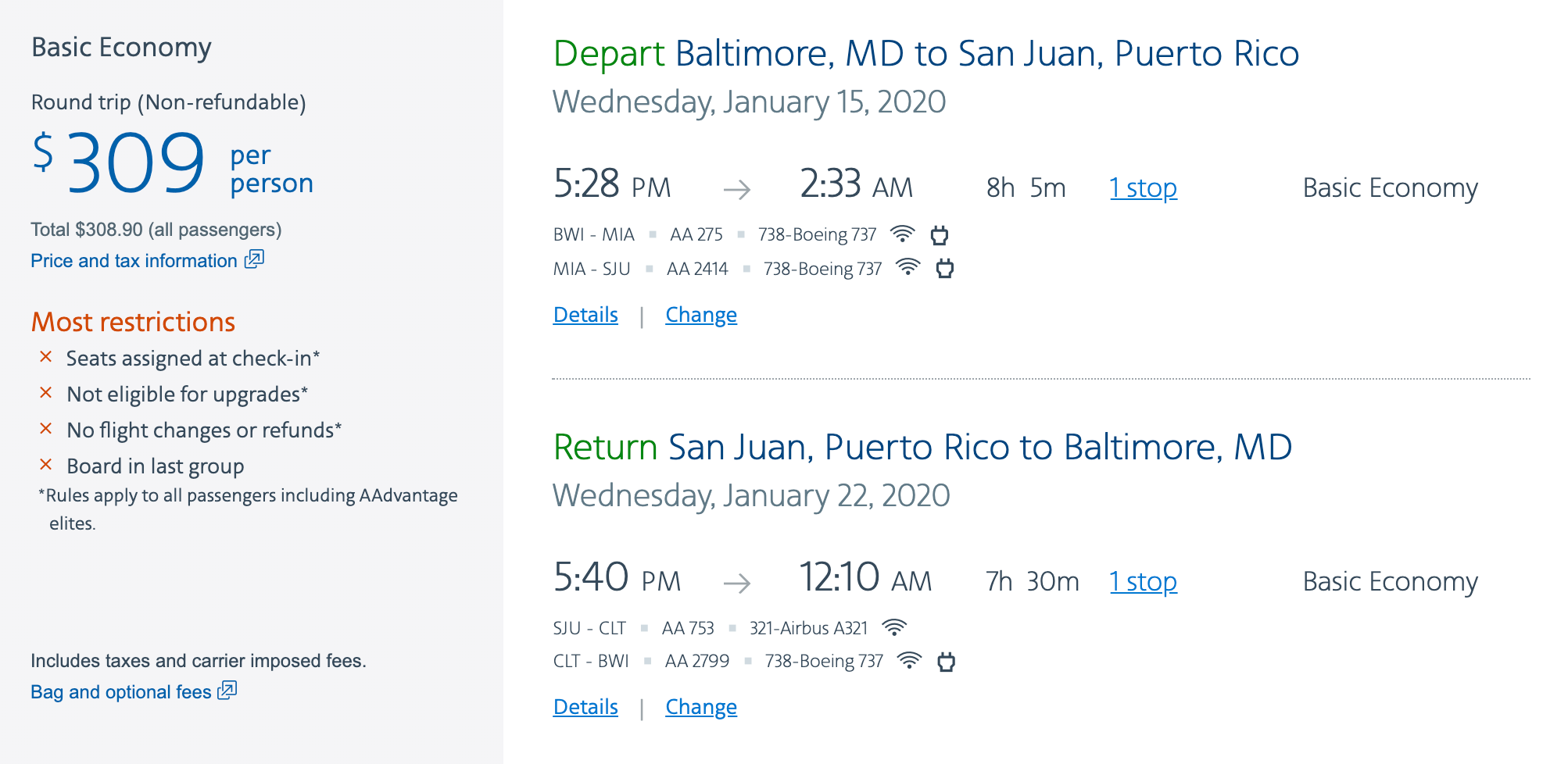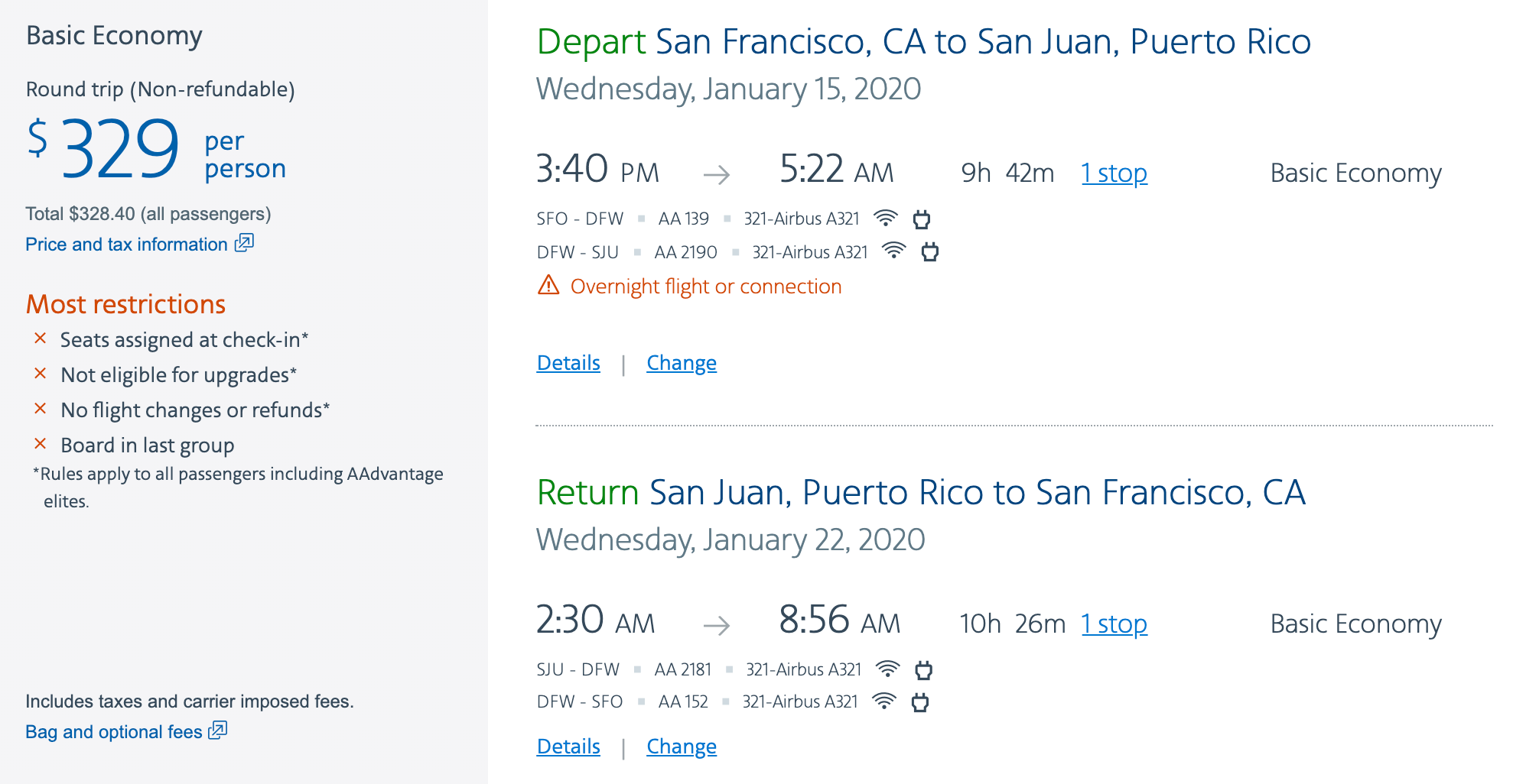 All of these low fares are in each airline's version of basic economy (except JetBlue), so you'll have to pay additional fees to check a bag and select seats ahead of time, and may not be eligible for upgrades. However, on American flights you can upgrade to the main cabin for an extra $50.