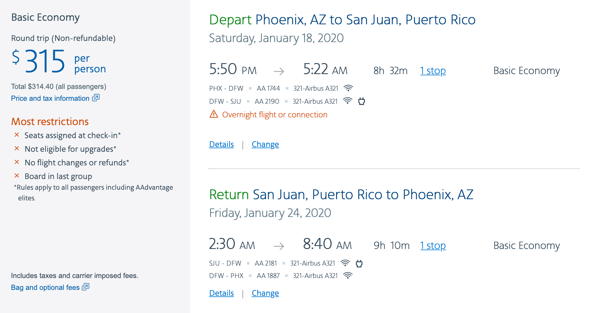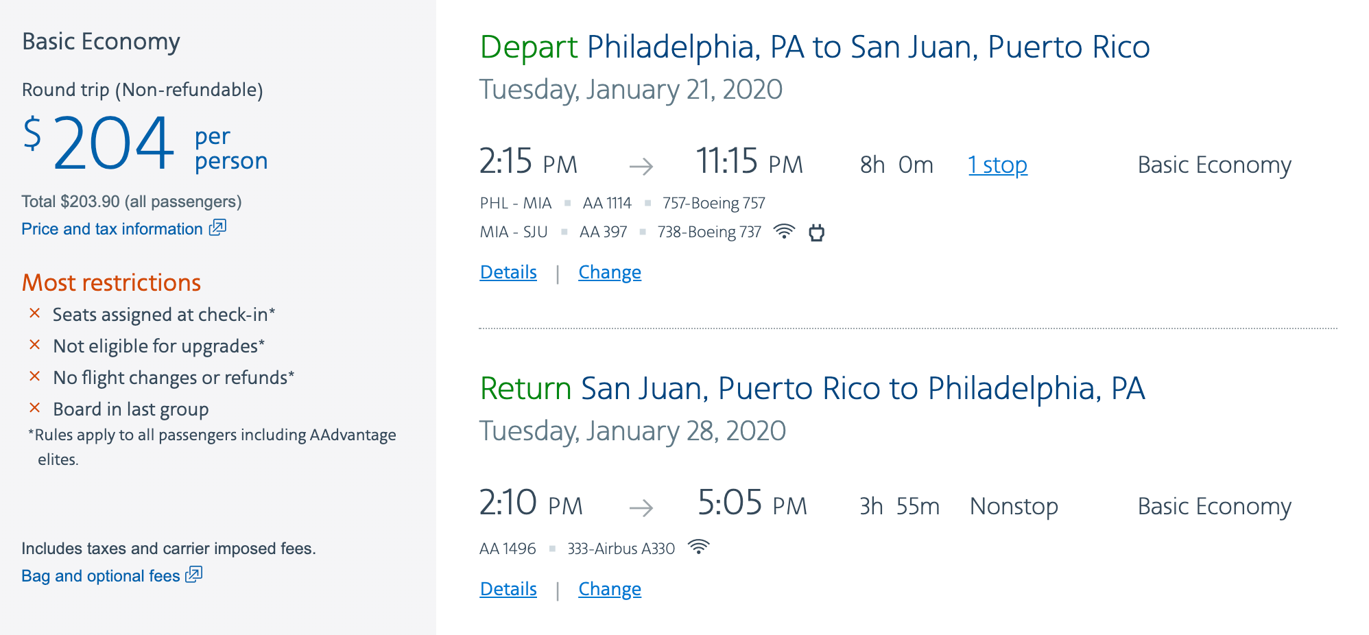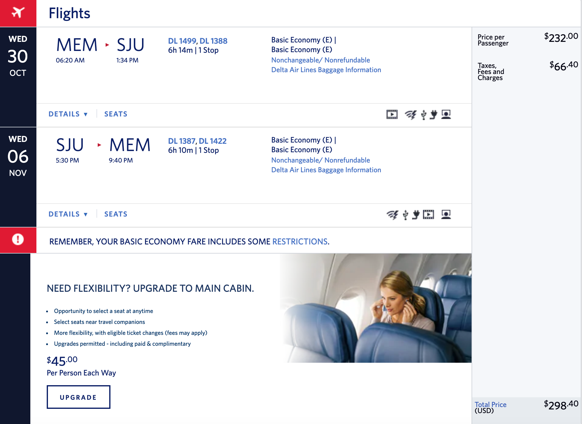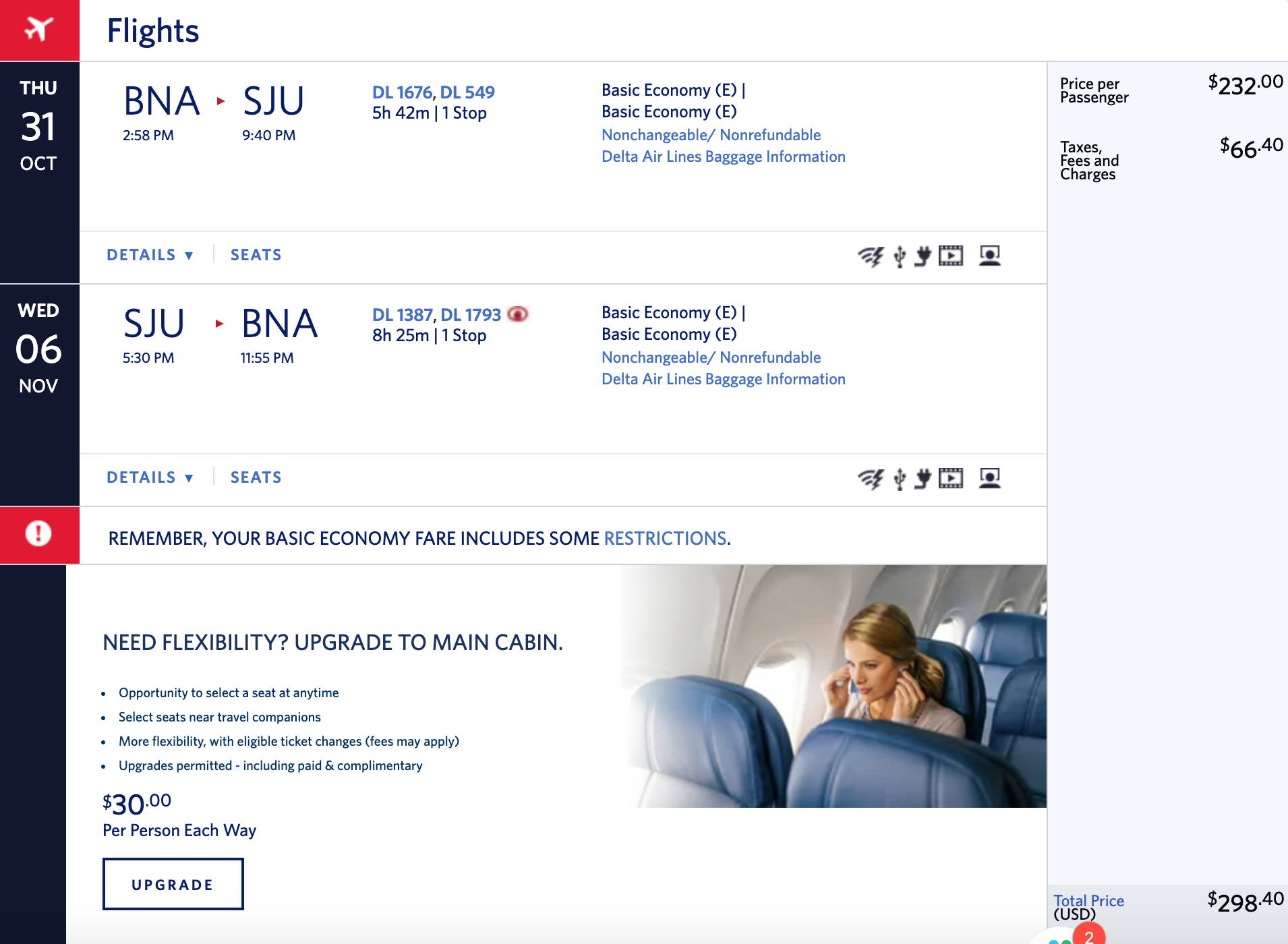 All of these low fares are in each airline's version of basic economy (except JetBlue), so you'll have to pay additional fees to check a bag and select seats ahead of time, and may not be eligible for upgrades. However, on American flights you can upgrade to the main cabin for an extra $50.