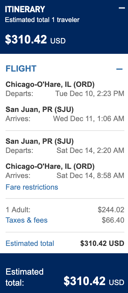 Chicago (ORD) to San Juan (SJU) for $310 round-trip on JetBlue: