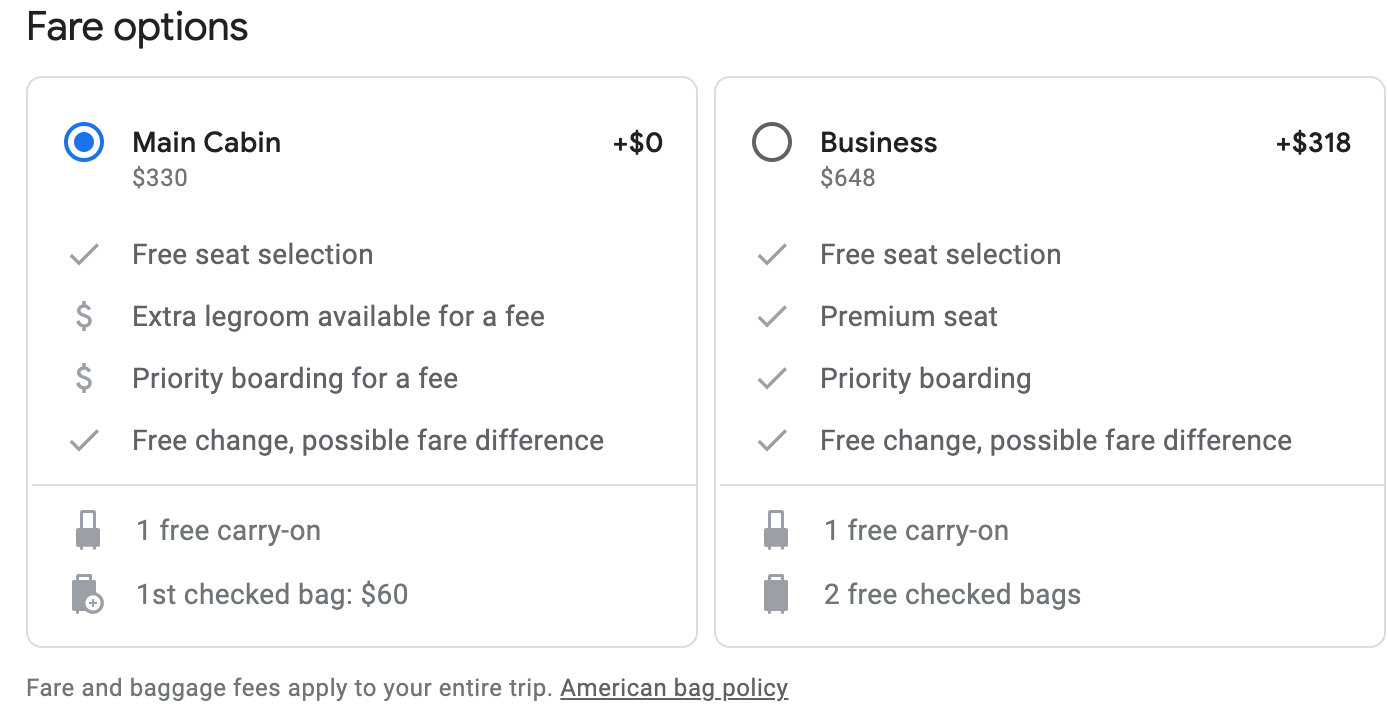 The above flight is for American's main cabin which includes a carry-on and assigned seating.