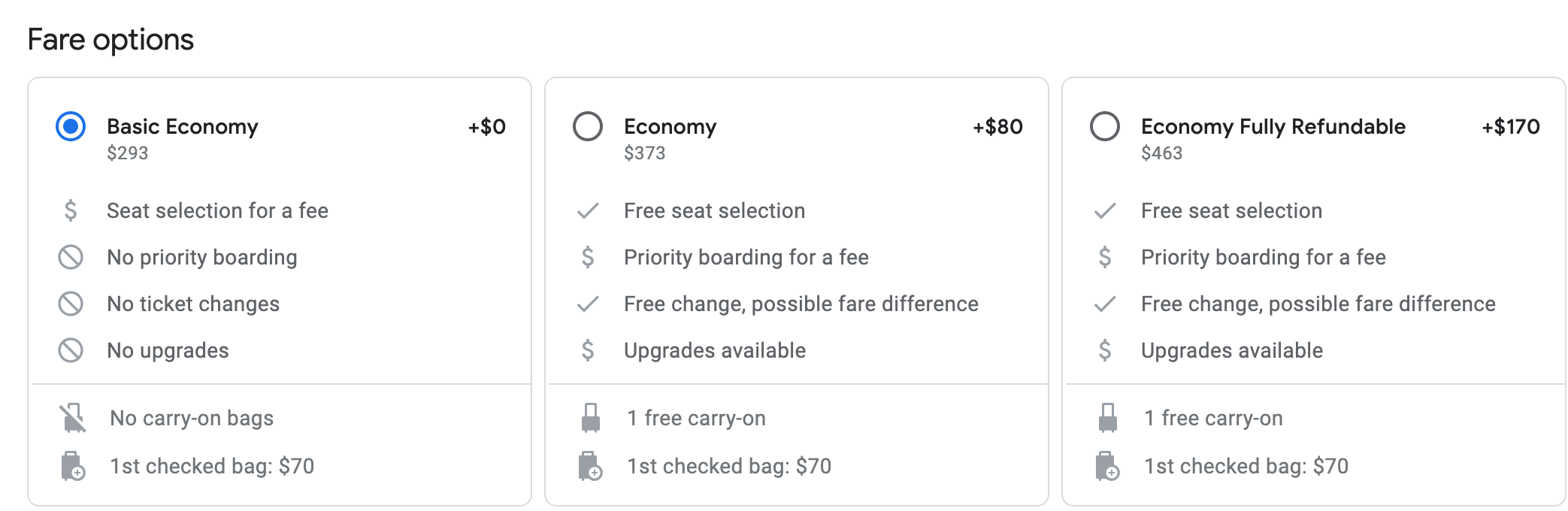 Because this particular flight is for United's basic economy, their lowest class, it does not include carry-on luggage, which is a real bummer. To rectify this, you can pay $80 more to upgrade to economy for one included carry-on in addition to free seat selection.