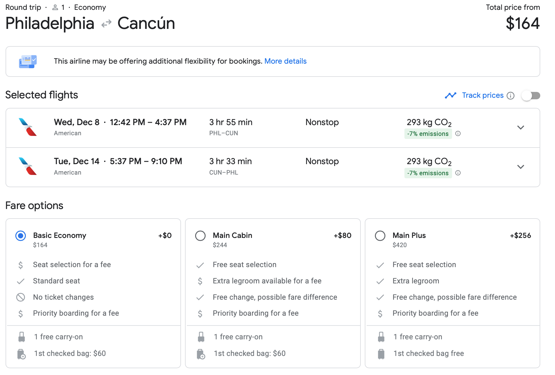 The availability isn't as great as in Dallas or Chicago, but we found several flights departing from Philadelphia to the Yucatan in November and December for just $164! It's a Basic Economy ticket via American, so you get a free carry-on bag but no seat selection option.
