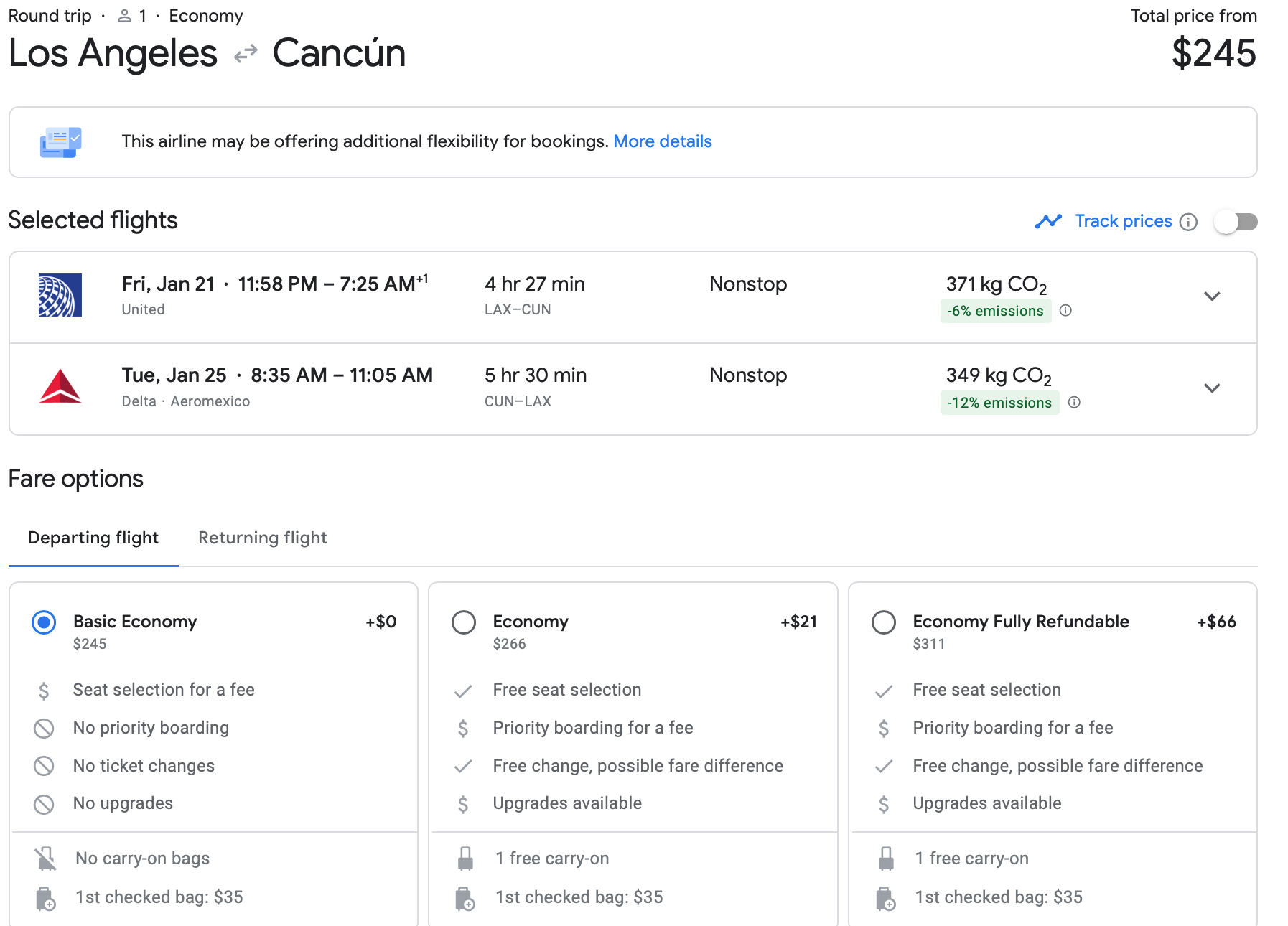 If you live in Los Angeles and want to take advantage of this deal, don't dawdle. We see the best values literally disappear as we searched Google Flights for the best prices. You can find $245 roundtrip fares to Cancun in December on a mixed itinerary (United and Delta tickets). It's a Basic Economy ticket, which on United means you don't get free seat selection, no carry-on, and the first checked bag is $35. You can bump up to Economy for just $21, which lets you choose your seat and gets you a carry-on bag, gratis.