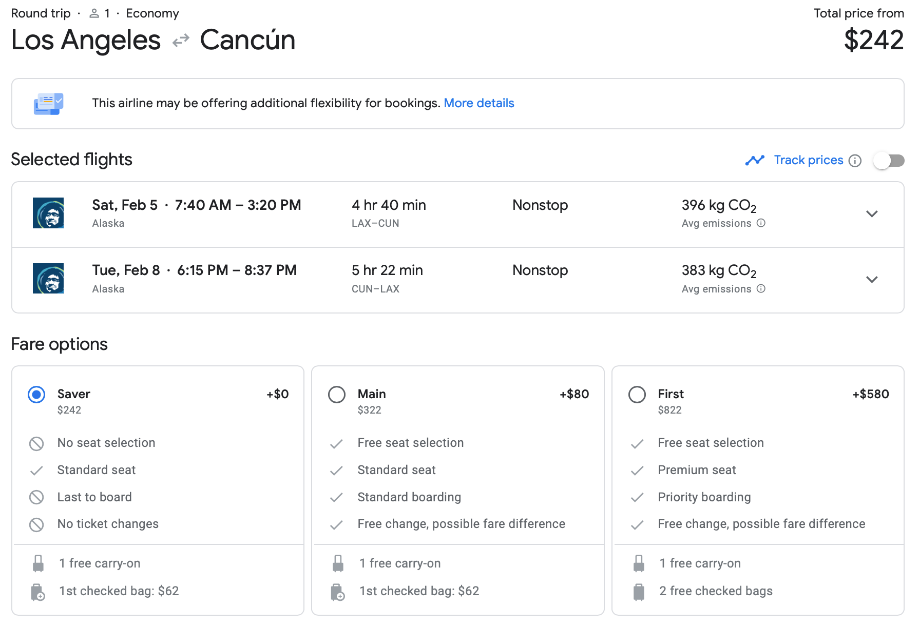 February also had nice options, including a nonstop ticket to Cancun from L.A. on Alaska Air for $243. That's less than half of what a roundtrip itinerary to Cancun usually costs. It's a Saver tier ticket, which means you're part of the last group to board the plane. Upside? You do get the free carry-on.