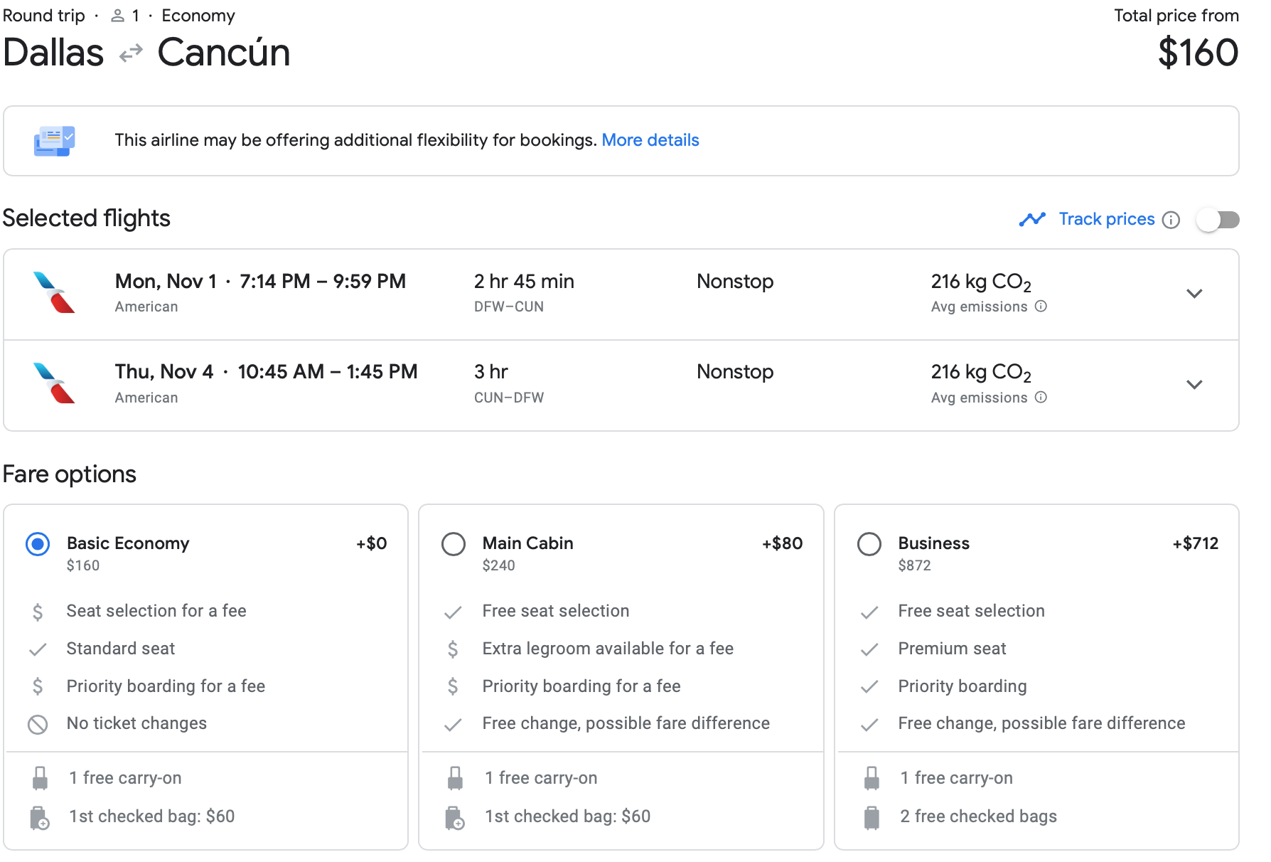 Dallas travelers can head south of the border for just $160 via American on a Basic Economy ticket, which comes with a free carry-on but no seat selection.