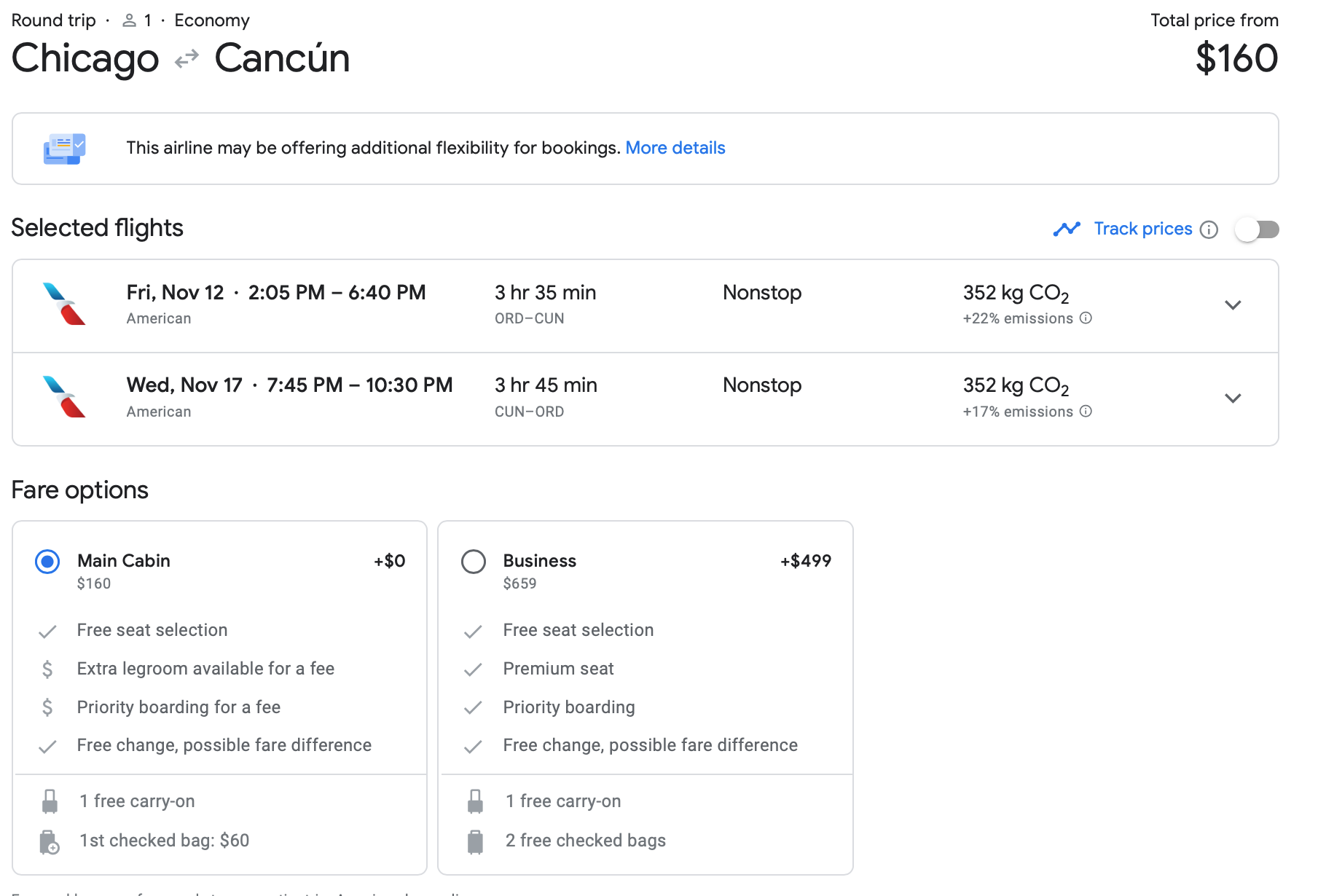 You can also score a $160 roundtrip ticket from Chicago (ORD) to Cancun in November. Note that this is a Main Cabin fare, which means a free carry-on and you get to pick your seat without having to pay a fee. Also, if you really wanted to splurge, you can upgrade your ticket to Business Class for $499.