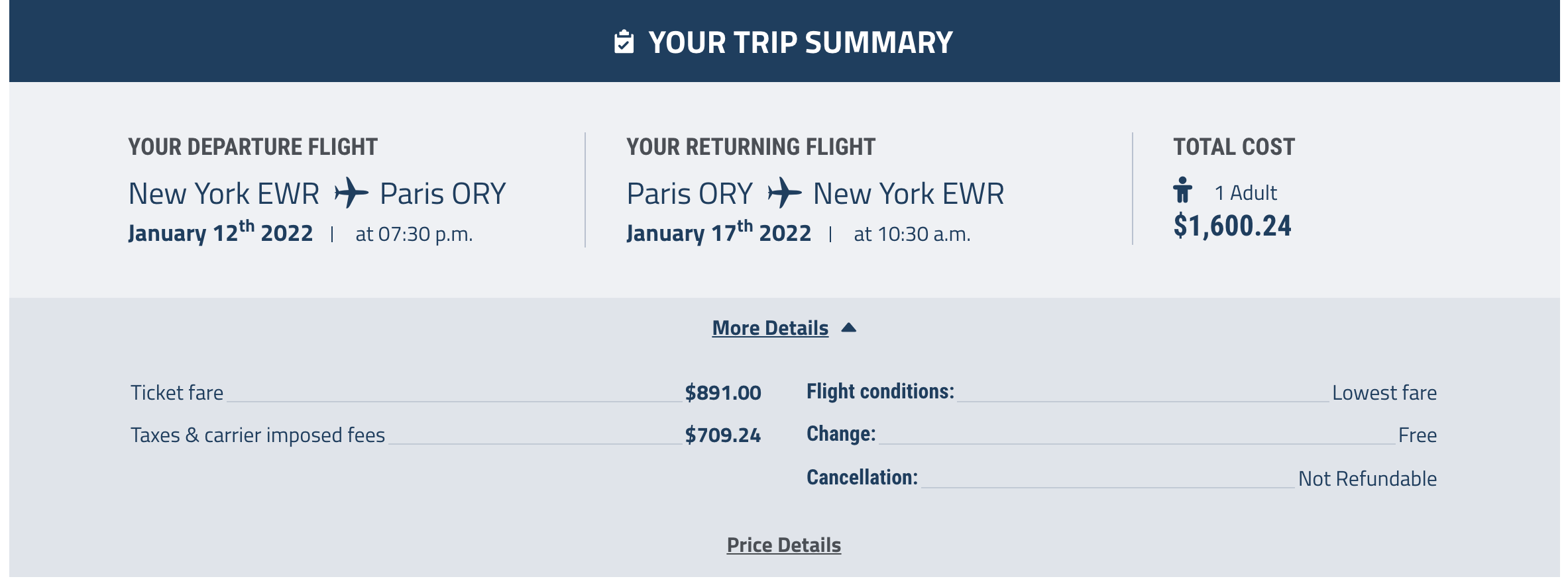 From there, I selected a nonstop flight departing Newark (EWR) on Jan. 12 and departing from Paris (ORY) on Jan. 17, for just over $1,600 round-trip.