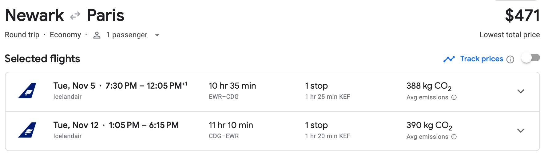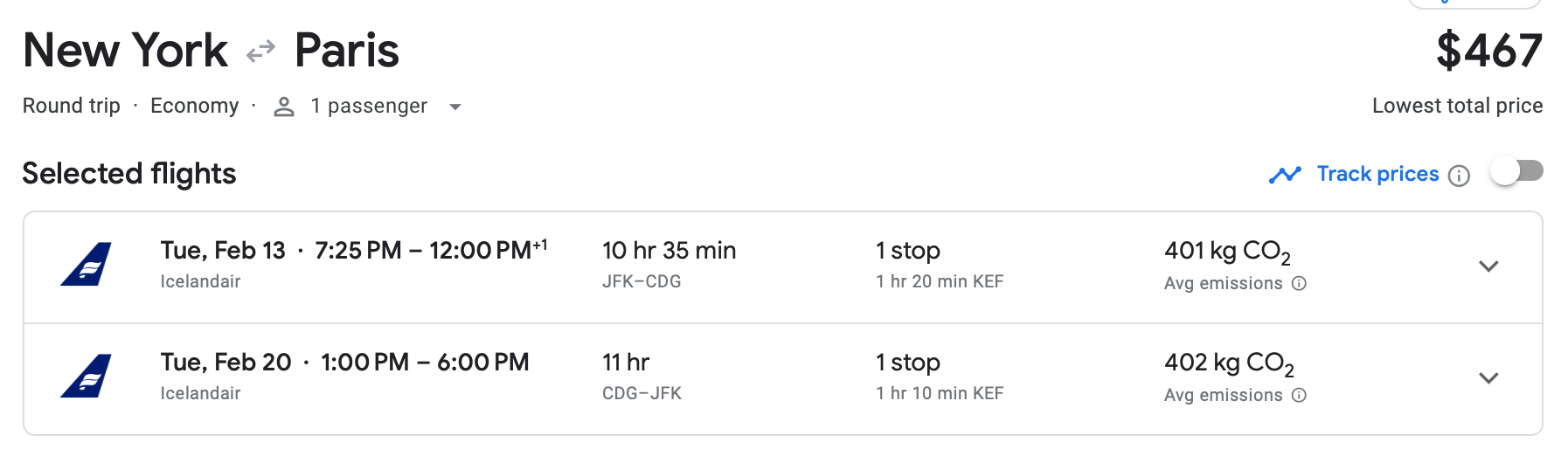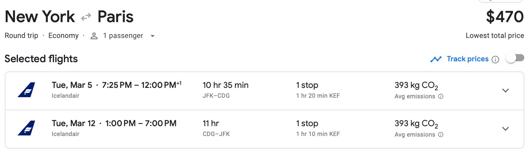 We found a similar fare price for the same route between New York City and Paris on Icelandair in March.