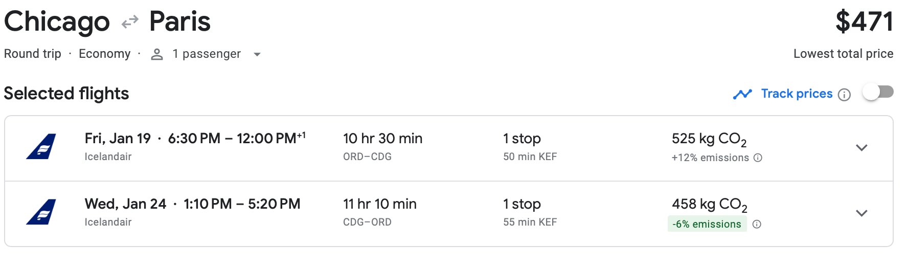 That's the same price we found for flights out of Chicago's O'Hare International Airport (ORD) to Paris in January, again on Icelandair. This route usually costs about twice that amount.