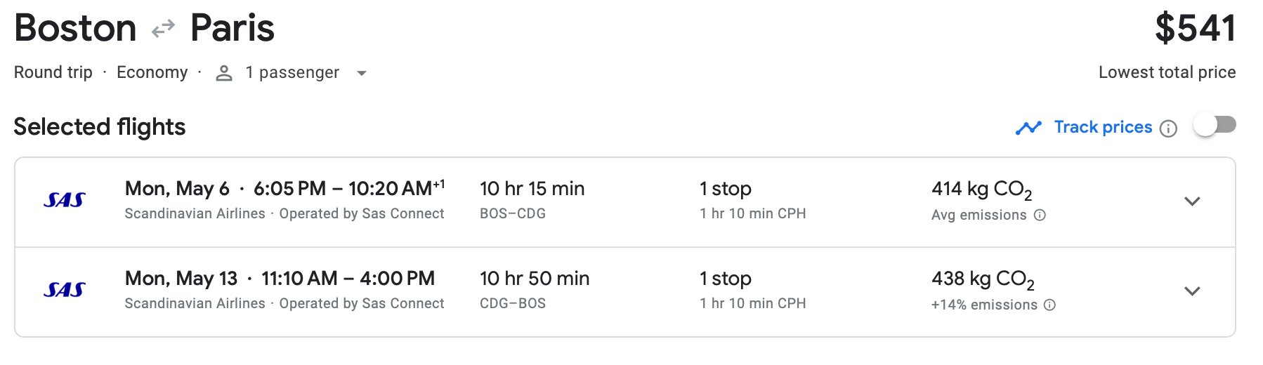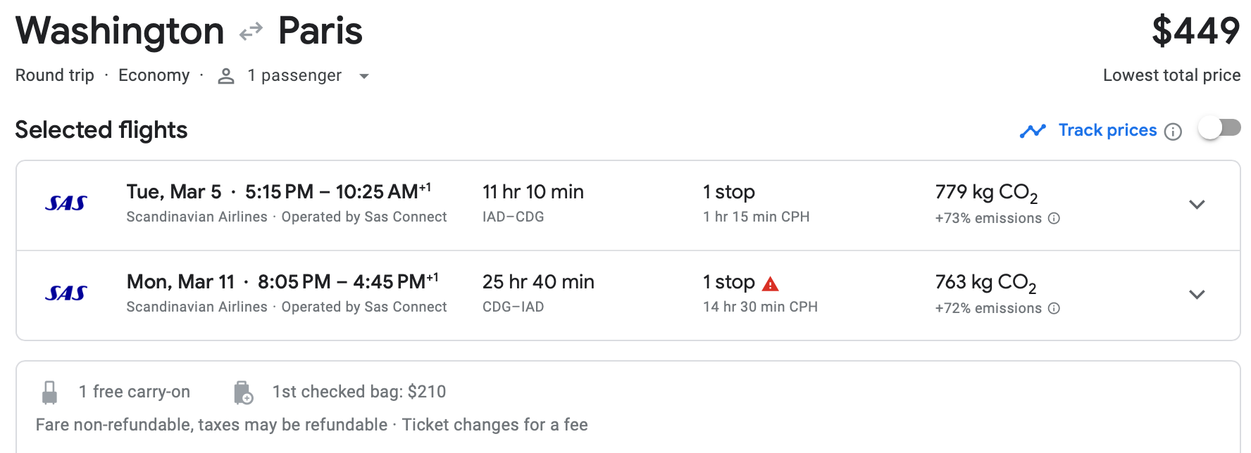This ticket includes a free carry-on bag, but a checked bag would cost you $210. So if you're a light packer, you can really save money here. Also, note that the return flight includes a long layover in Copenhagen, but hey, there are worse cities to spend a day in.