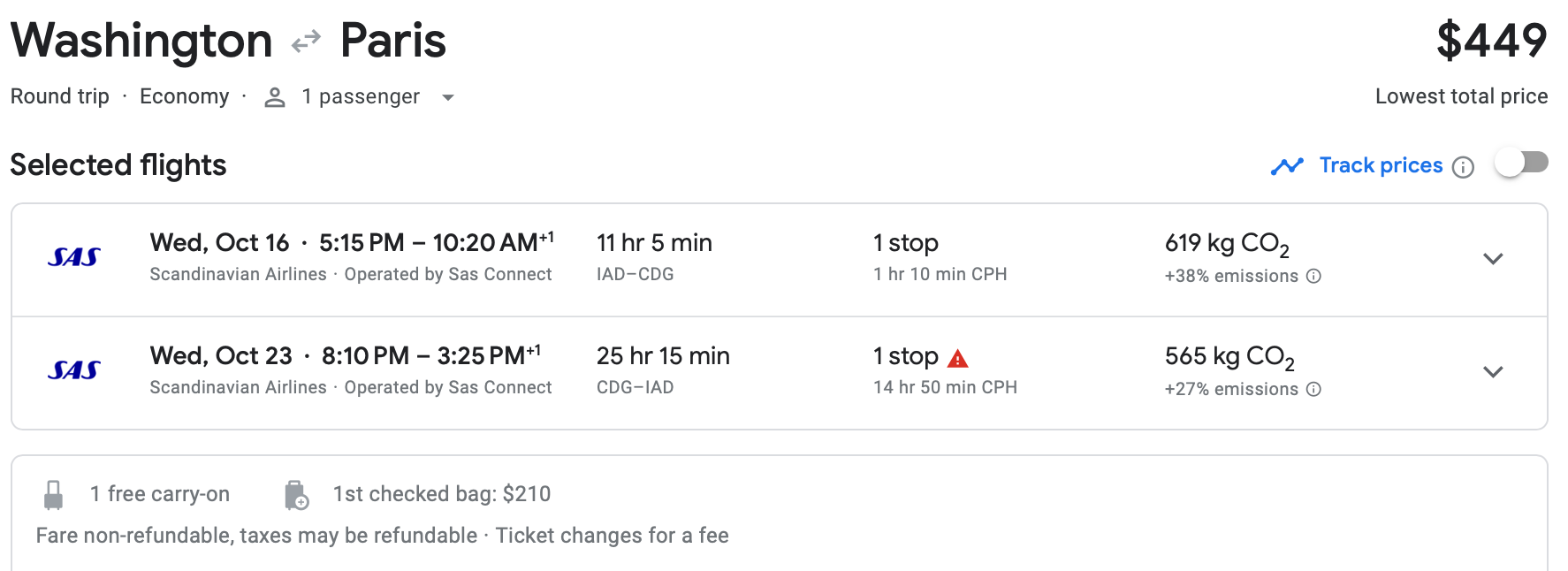 SAS also has the same $449 fare price for the Washington, D.C.-to-Paris route in October if you're looking to do some long-range vacation planning.