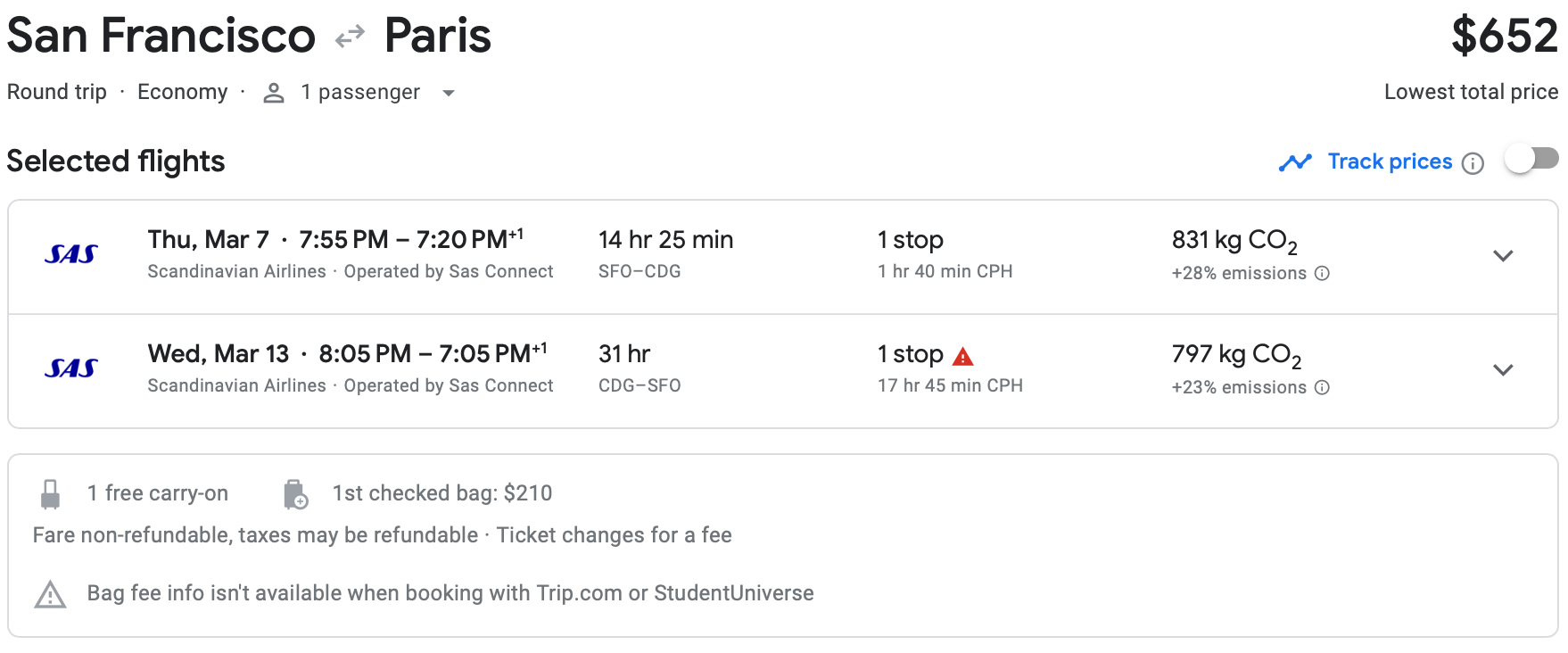 While West Coast flights to Paris are a bit more expensive, there are still deals to be found. SAS has flights from San Francisco International Airport (SFO) to Paris in March for $652, a notable discount from normal prices.
