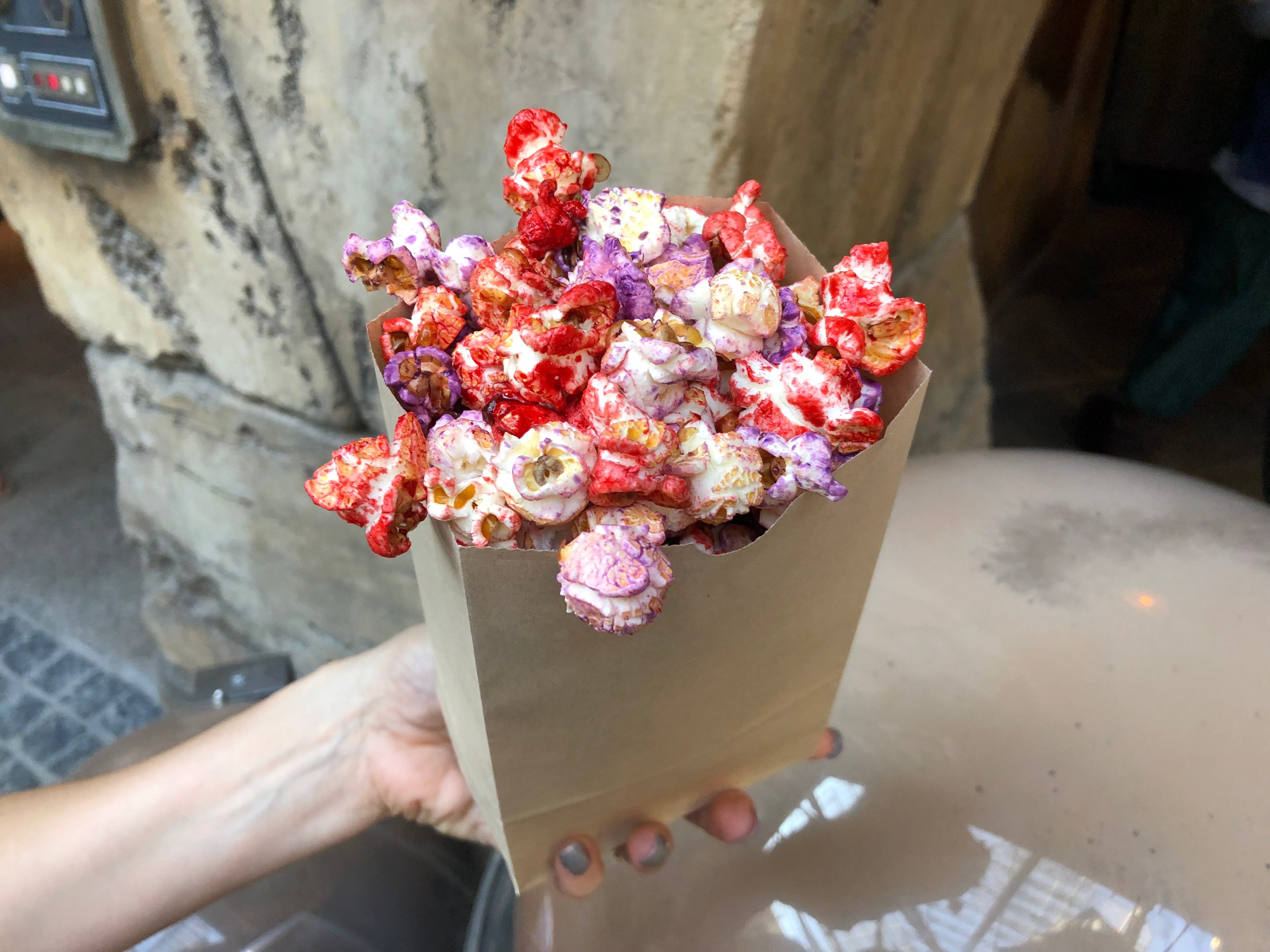 Outpost Popcorn Mix. Kat Saka's Kettle is a shop in the Black Spire Market serving only one food choice: Outpost Popcorn Mix. The colors are bold purples and reds and the flavor is sweet and spicy. The first few bites were a bit weird, but the dish became rapidly addictive. If you like kettle corn and don't mind a tiny bit of spice, this will be a hit. I even think many kids will enjoy it as well.