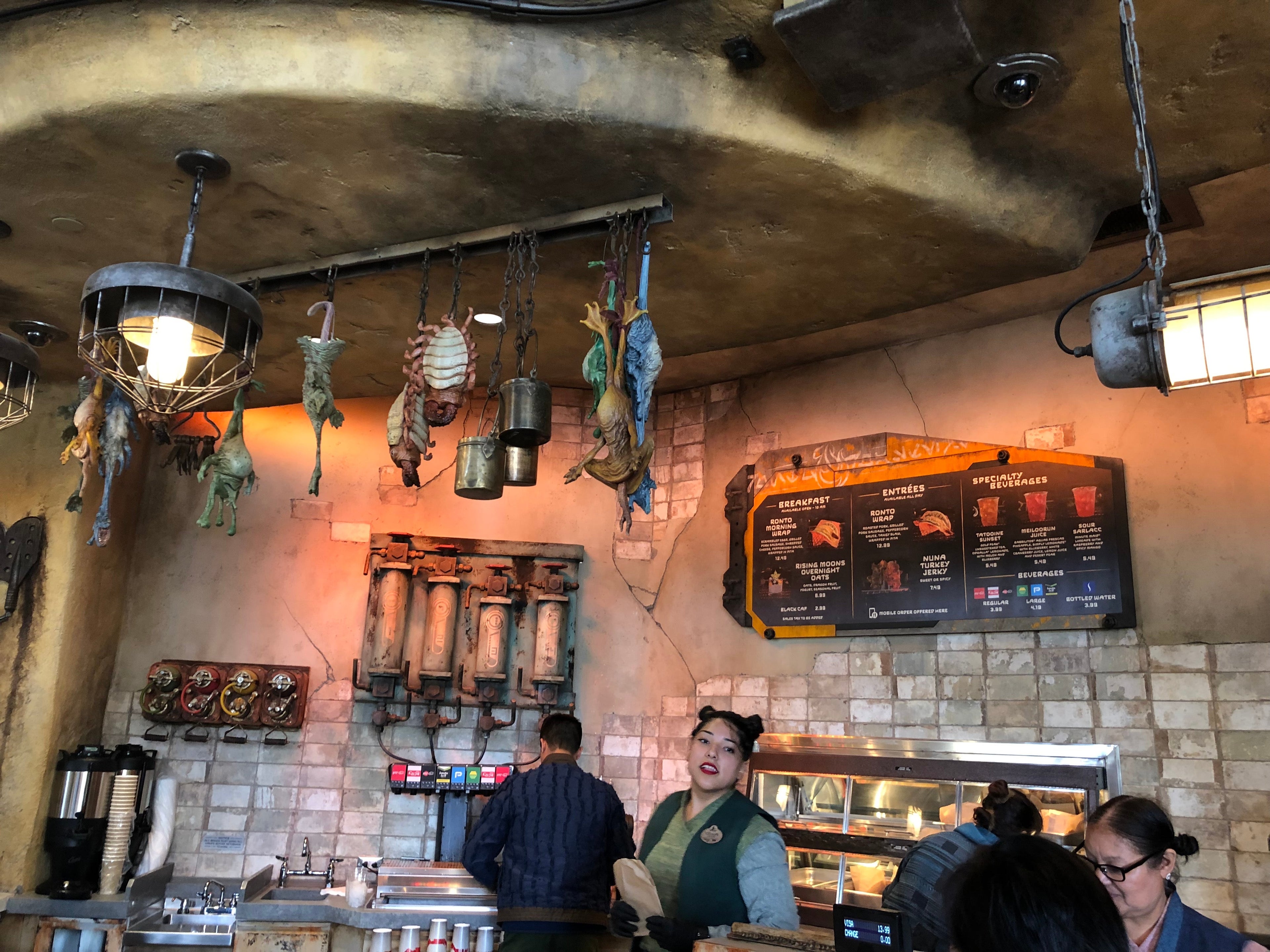 Not far from Docking Bay 7 in the market is a smaller food counter, Ronto Roasters, serving just a couple of items. Outside, a droid turns "space meat" on a spit heated by a podracing engine. Mobile ordering is also available at this restaurant to save valuable time in the land.