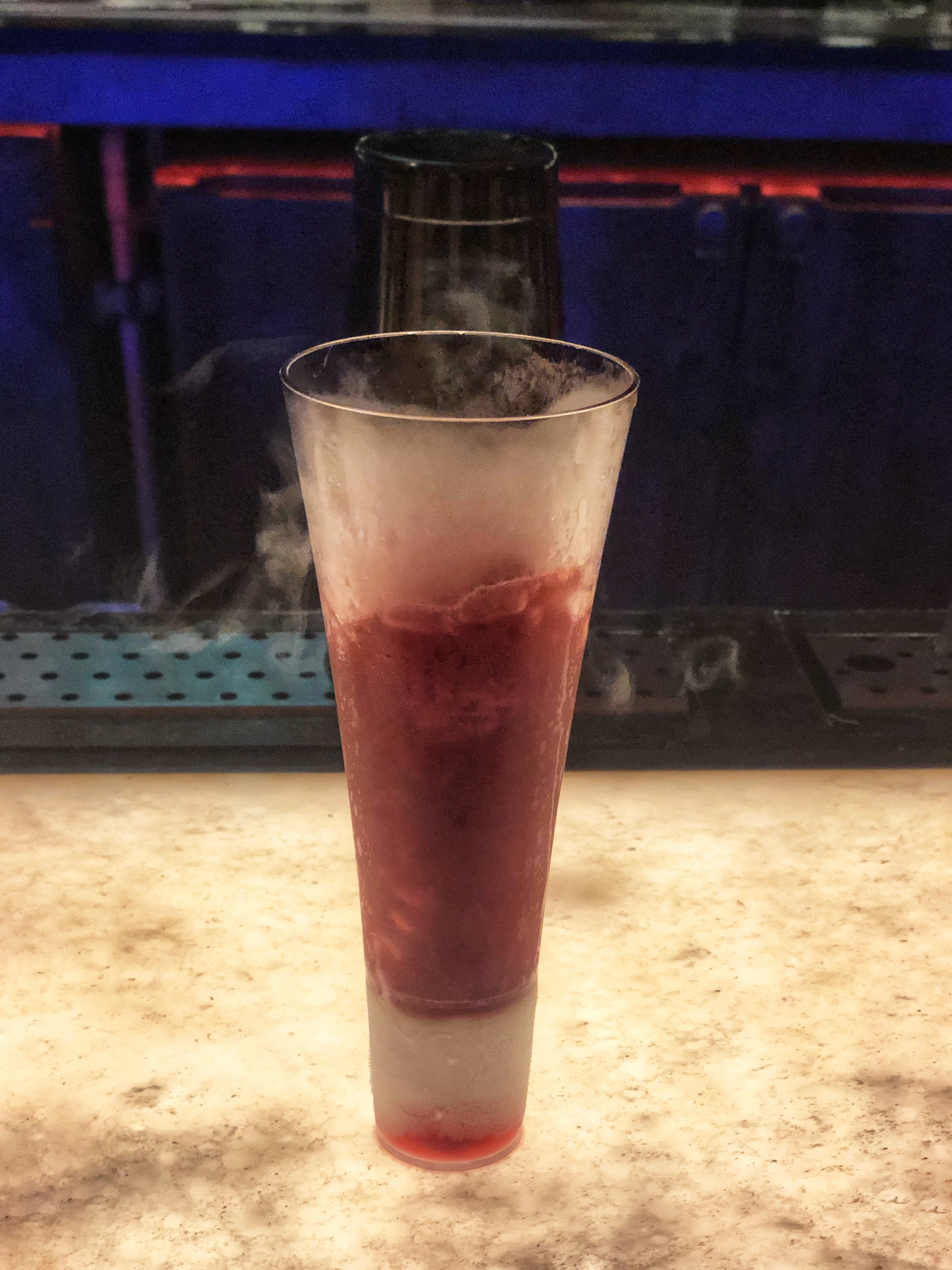 Bespin Fizz. This rum-based drink combines yuzu purée, pomegranate juice and white cranberry juice. It's topped with a cloud swirl that spills over the edge of the glass like a dry ice fog. We couldn't taste much alcohol in it (especially after the Yub Nub, which definitely packs a punch), but the fruity flavor was refreshing. It's a much smaller drink that goes down quickly.