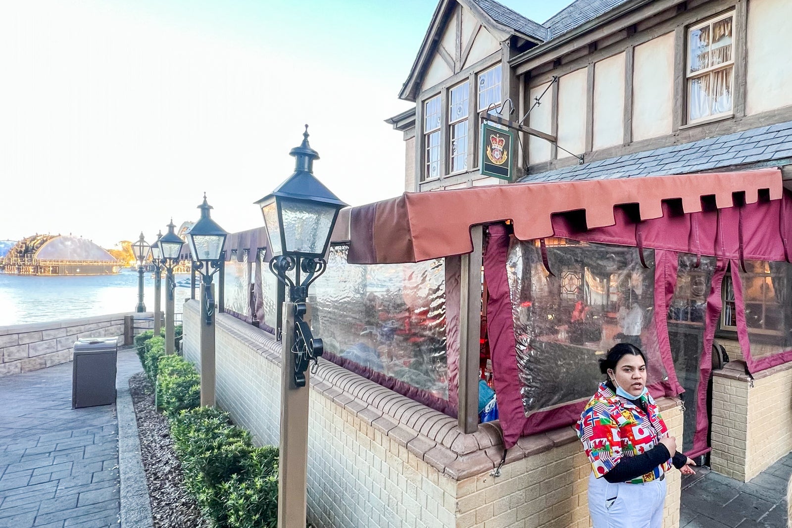 This cozy pub in the U.K. pavilion includes plenty of outdoor, waterfront seating overlooking World Showcase Lagoon. Just make sure you confirm your outdoor seating preference when you check-in for your reservation. A jolly good menu of British classics including top-notch fish and chips, bangers and mash and shepherd's pie are best enjoyed with a proper pint or nip of scotch whisky and some sticky toffee pudding for dessert.