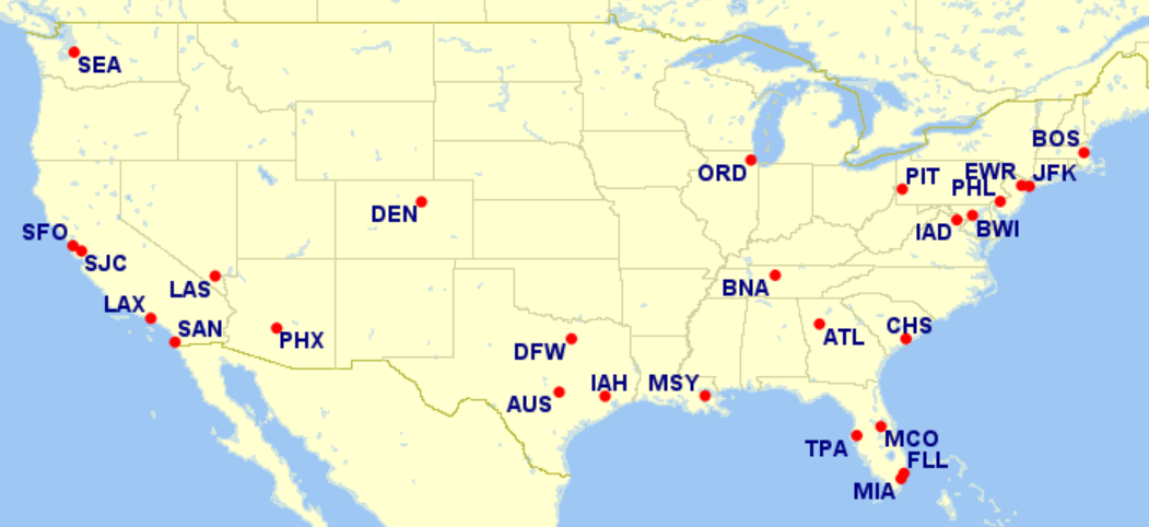 Atlanta (ATL), Austin (AUS), Baltimore (BWI), Boston (BOS), Charleston (CHS), Chicago (ORD), Dallas/Fort Worth (DFW), Denver (DEN), Fort Lauderdale (FLL), Houston (IAH), Las Vegas (LAS), Los Angeles (LAX), Miami (MIA), Nashville (BNA), New Orleans (MSY), New York Kennedy (JFK), Newark (EWR), Orlando (MCO), Philadelphia (PHL), Phoenix (PHX), Pittsburgh (PIT), San Diego (SAN), San Francisco (SFO), San Jose (SJC), Seattle (SEA), Tampa (TPA) and Washington, DC (IAD)