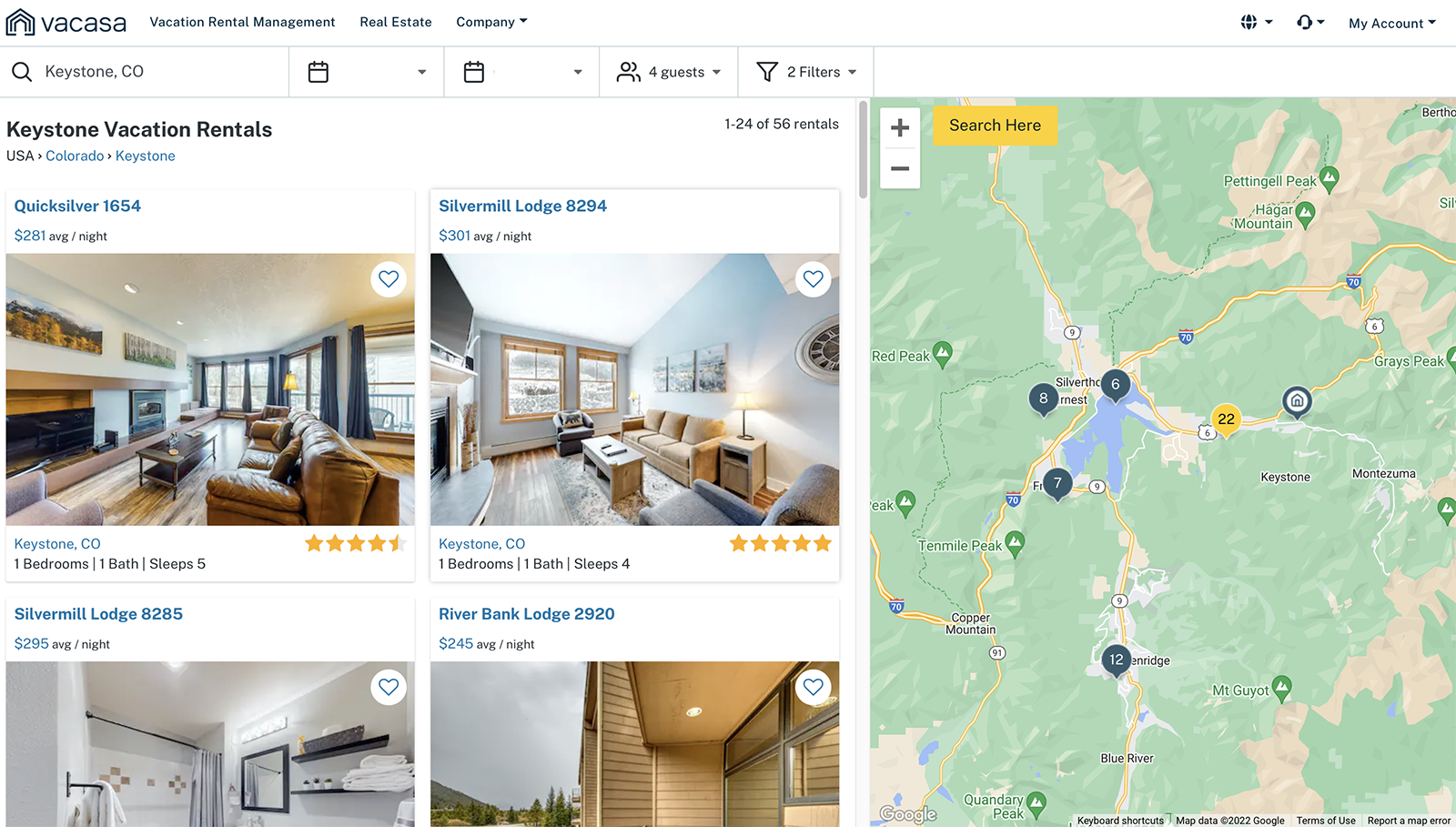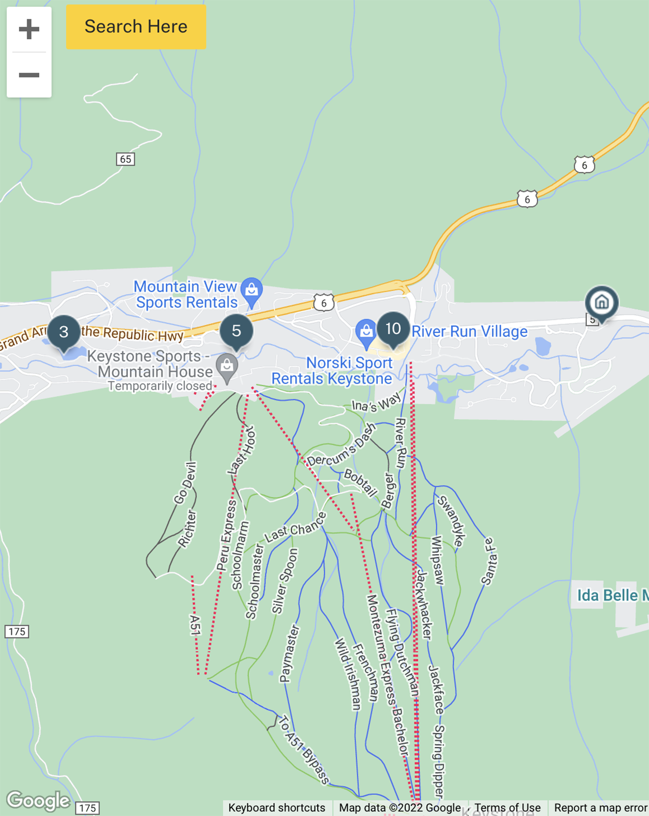 Quite a few options appeared. I zoomed in on the map to find walkable/shuttle distances to Keystone and used the "Search Here" feature to limit the area. At that point, I had what I suspected were properties bookable on points.