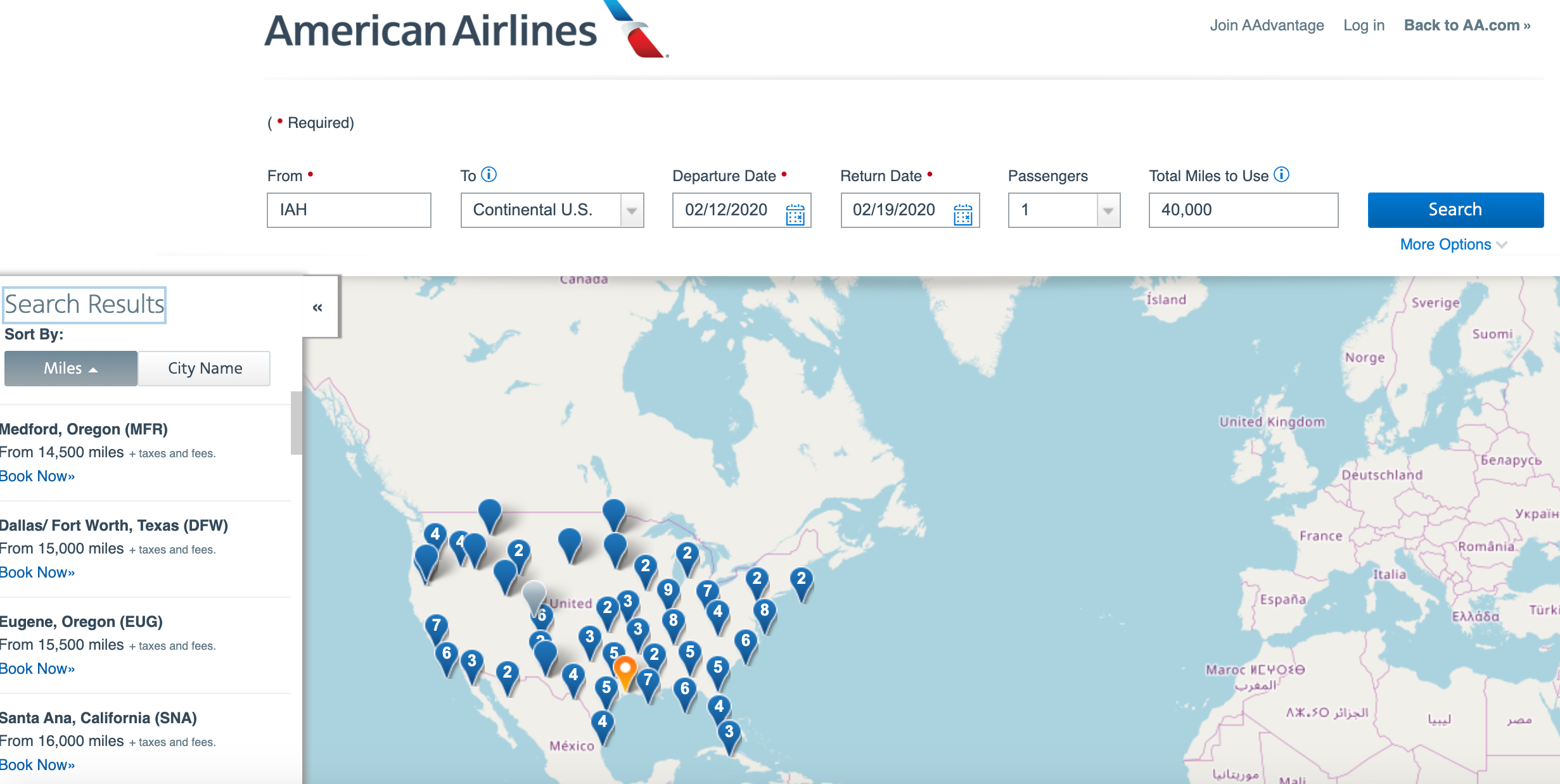 In this example, I selected February travel dates and Dallas (DFW) as a departure airport and some of the cheapest destinations in the U.S. that were returned were: Bend, Oregon; Boston; Las Vegas; San Francisco; and Seattle -- all of which can be booked for 10,000 American miles round-trip.