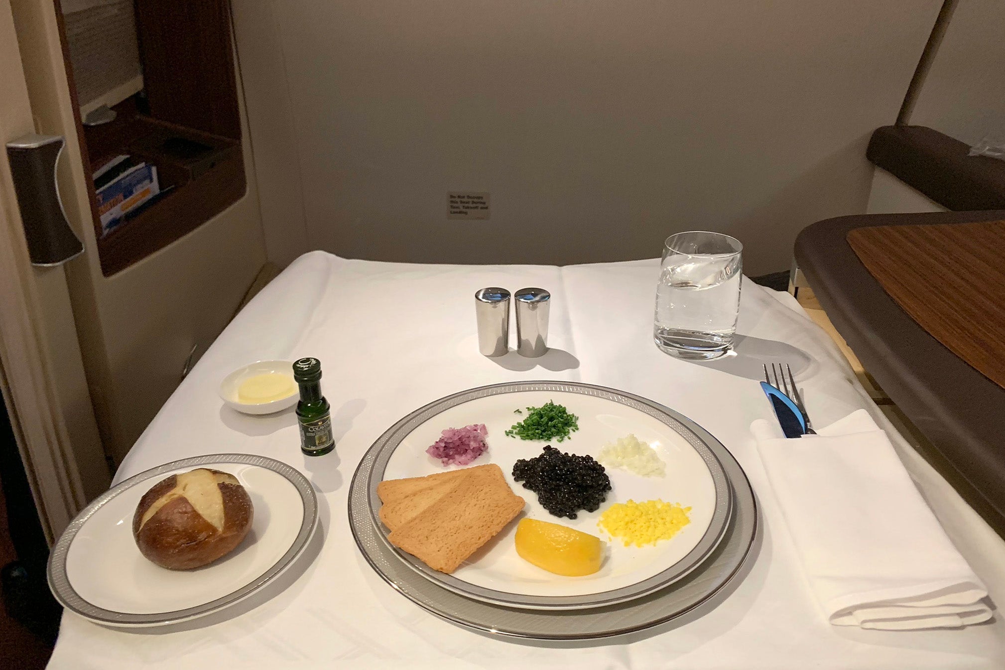 On most flights, you can start your meal with a generous dollop of caviar and all the usual sides.